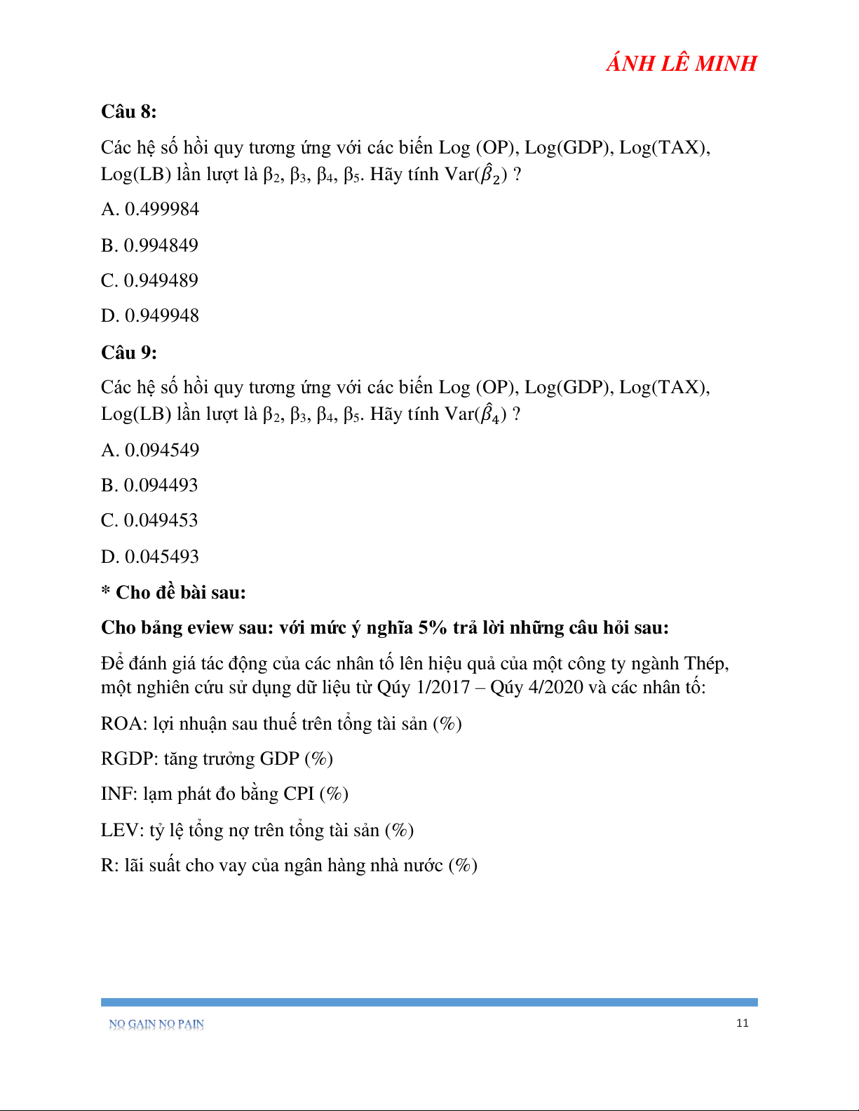 Câu 2: Tính 𝜎2 ? A. 0.046092 B. 0.046094 C. 0.064094 D. 0.064092 9 ÁNH LÊ MINH