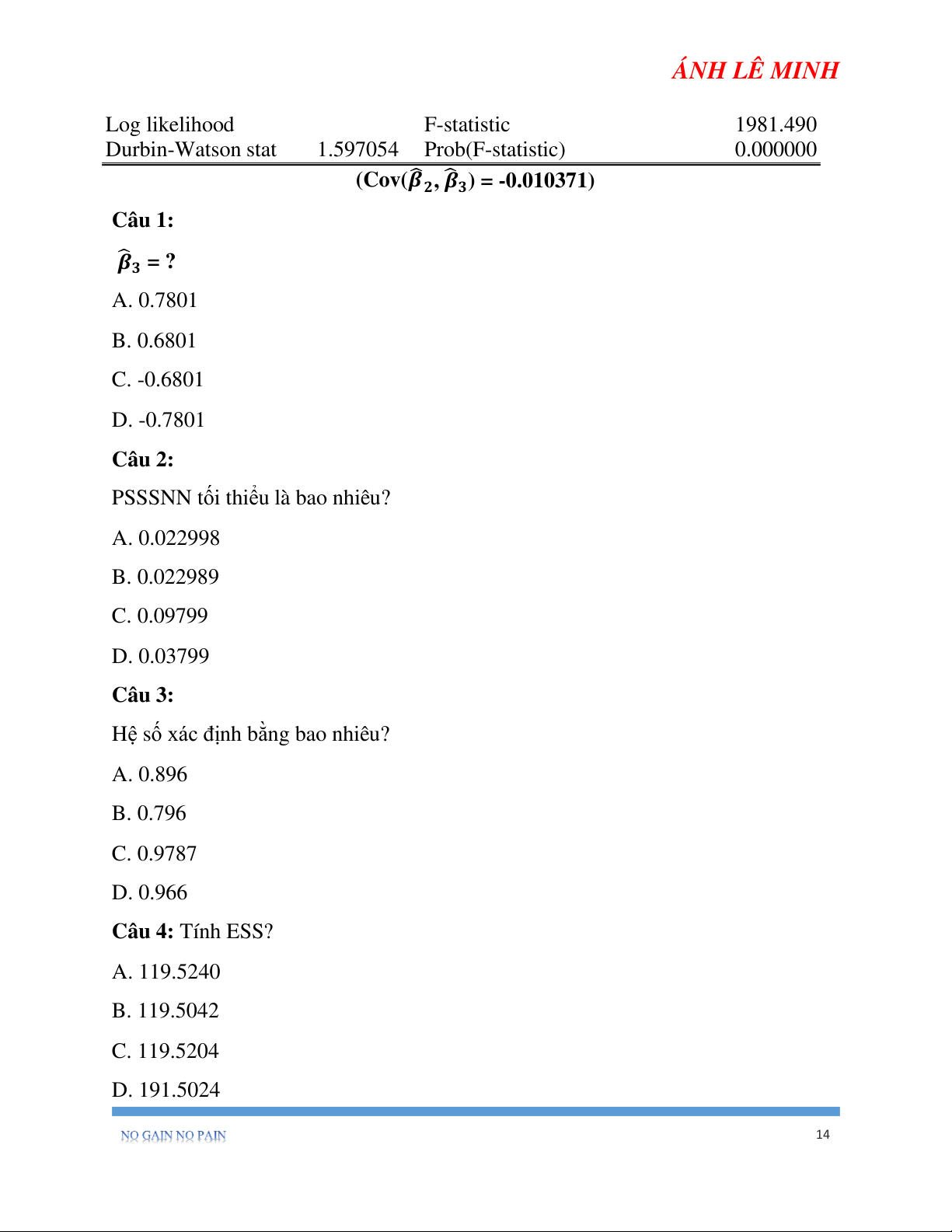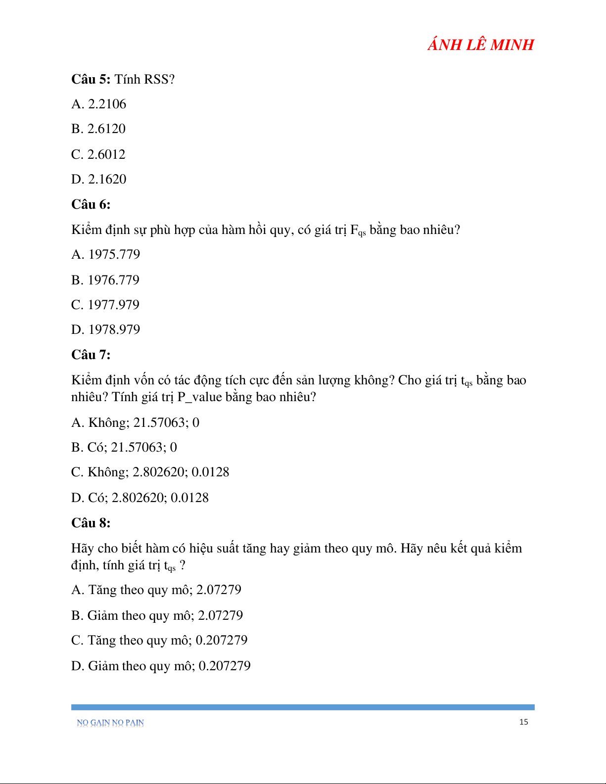 Hệ số xác định bằng bao nhiêu? A. 0.896 B. 0.796 C. 0.9787 D. 0.966 Câu 4: Tính ESS? A. 119.5240 B. 119.5042 C. 119.5204 D. 191.5024 14 ÁNH LÊ MINH Câu 5: Tính RSS? A. 2.2106 B. 2.6120 C. 2.6012 D. 2.1620 Câu 6: