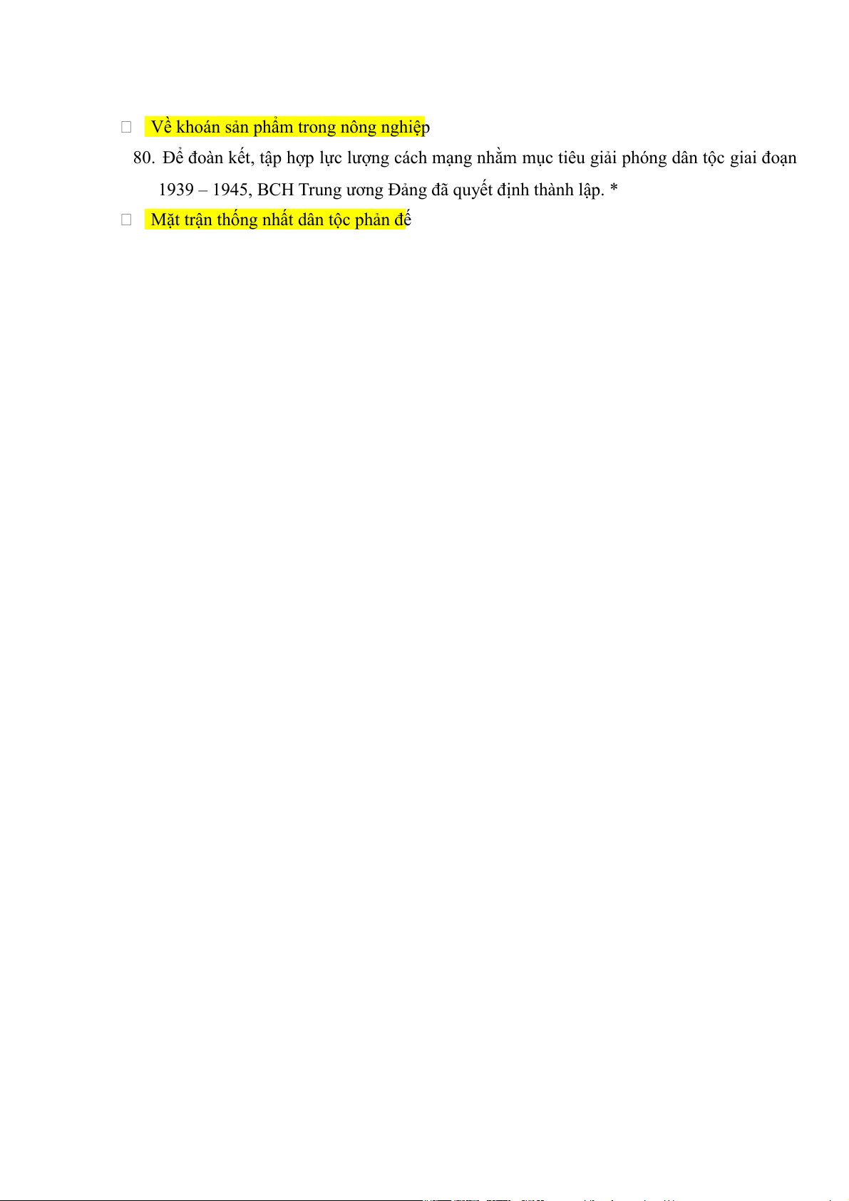 80. Để đoàn kết, tập hợp lực lượng cách mạng nhằm mục tiêu giải phóng dân tộc giai đoạn