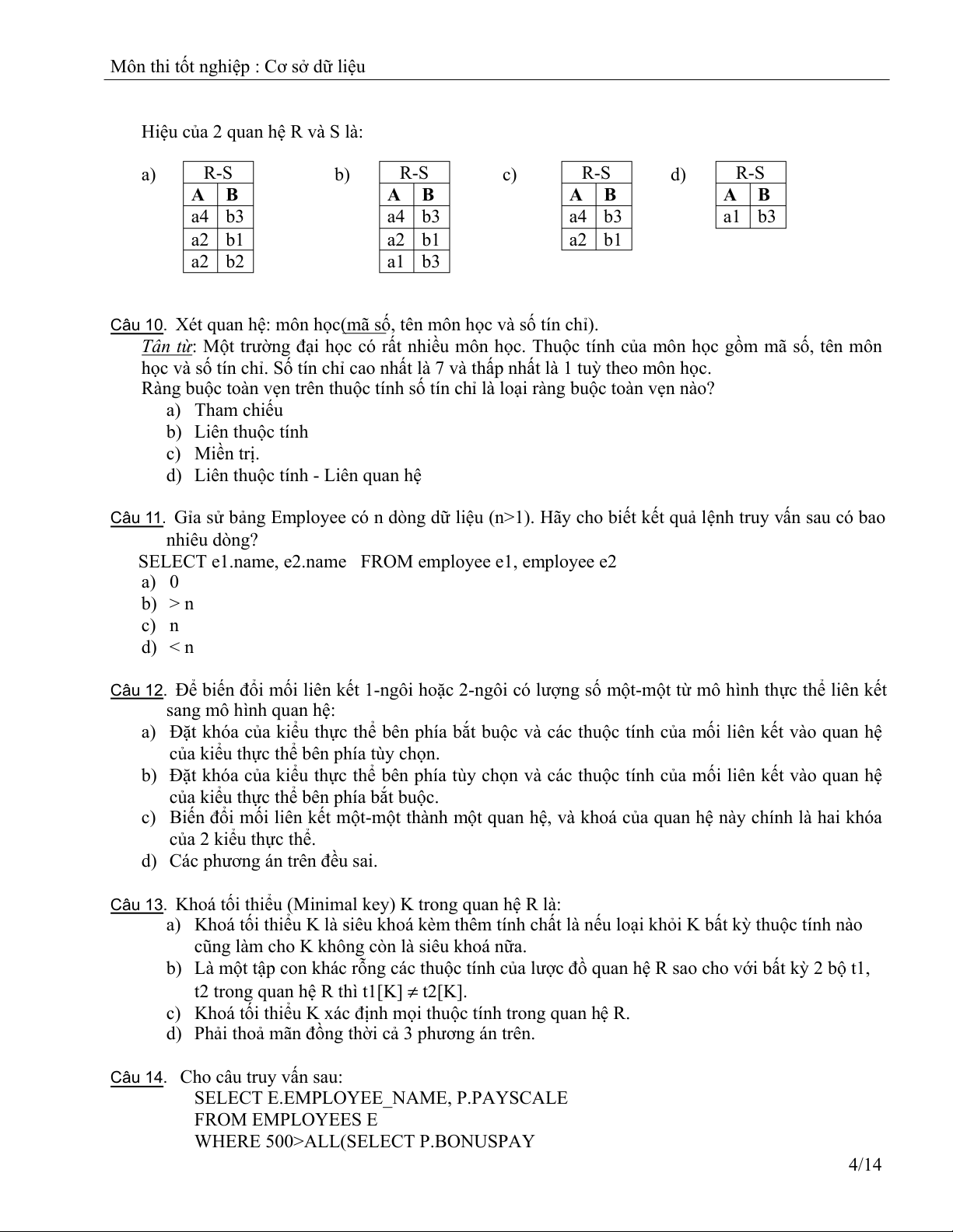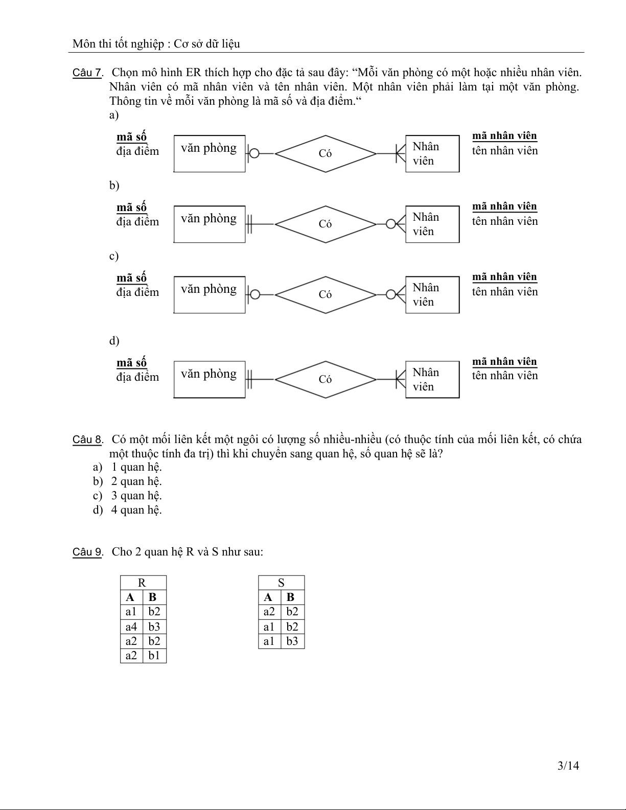 Câu 9. Cho 2 quan hệ R và S như sau: R S A B A B a1 b2 a2 b2 a4 b3 a1 b2 a2 b2 a1 b3 a2 b1 3/14