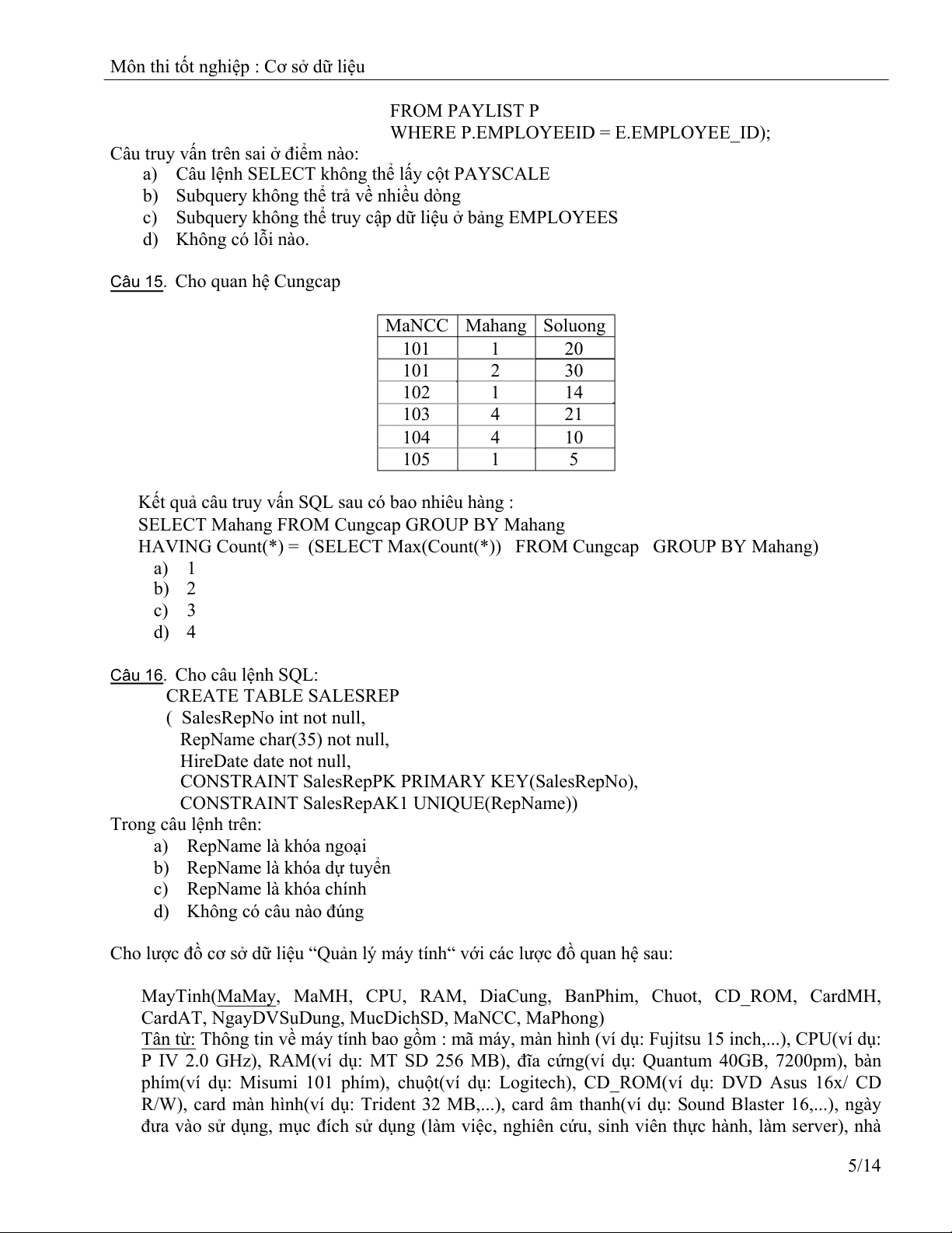 HAVING Count(*) = (SELECT Max(Count(*)) FROM Cungcap GROUP BY Mahang) a) 1 b) 2 c) 3 d) 4 Câu 16. Cho câu lệnh SQL: CREATE TABLE SALESREP ( SalesRepNo int not null, RepName char(35) not null, HireDate date not null,