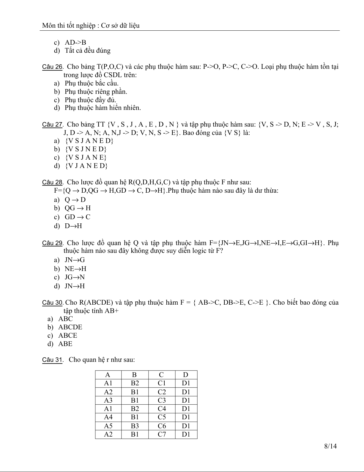 Câu 31. Cho quan hệ r như sau: A B C D A1 B2 C1 D1 A2 B1 C2 D1 A3 B1 C3 D1 A1 B2 C4 D1 A4 B1 C5 D1 A5 B3 C6 D1 A2 B1 C7 D1 8/14