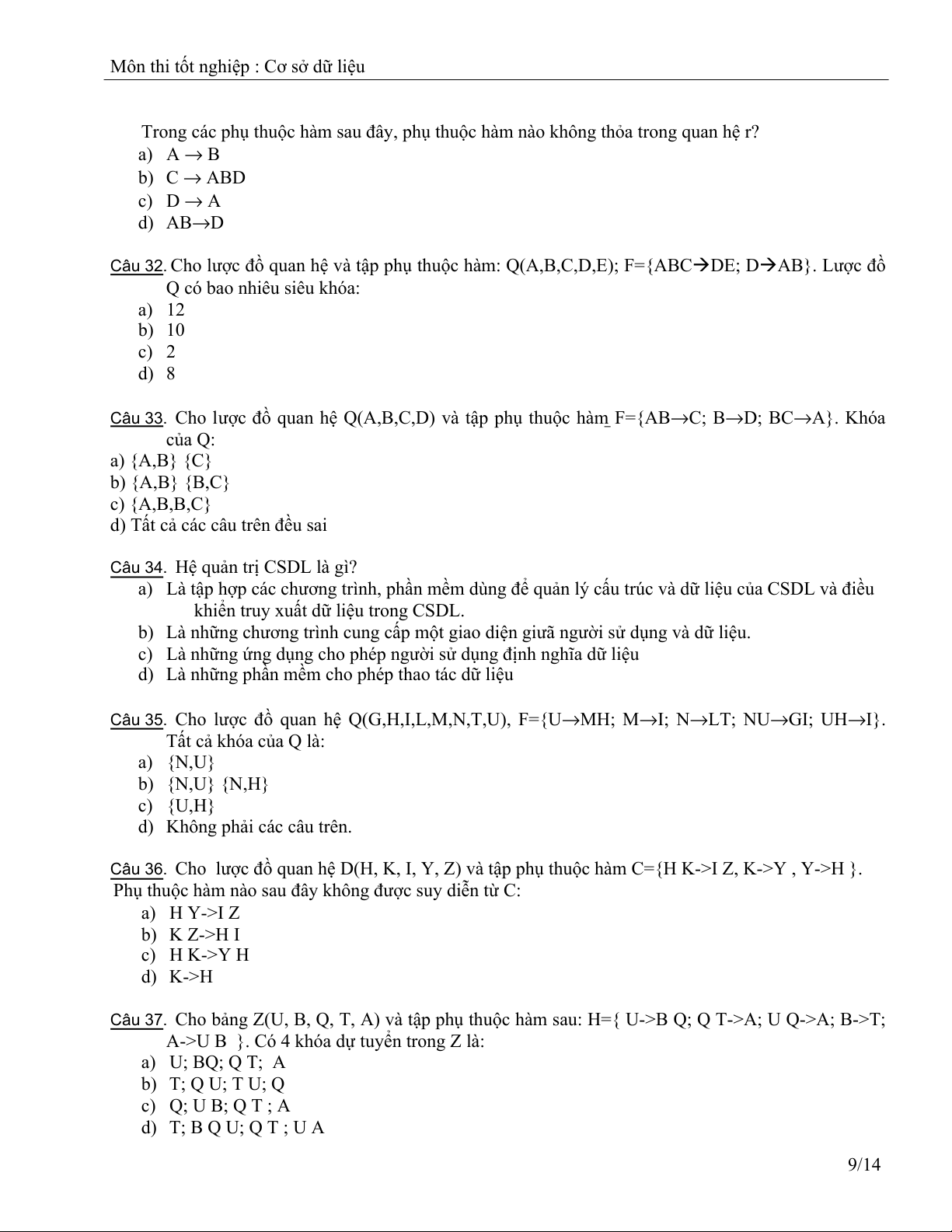Câu 32. Cho lược đồ quan hệ và tập phụ thuộc hàm: Q(A,B,C,D,E); F={ABCÆDE; DÆAB}. Lư c ợ đồ Q có bao nhiêu siêu khóa: a) 12 b) 10 c) 2 d) 8