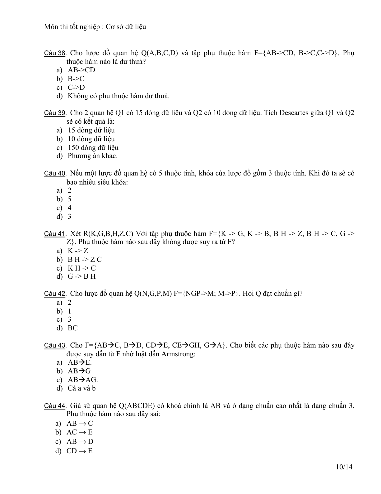 Câu 44. Giả sử quan hệ Q(ABCDE) có khoá chính là AB và ở dạng chuẩn cao nhất là dạng chuẩn 3.
