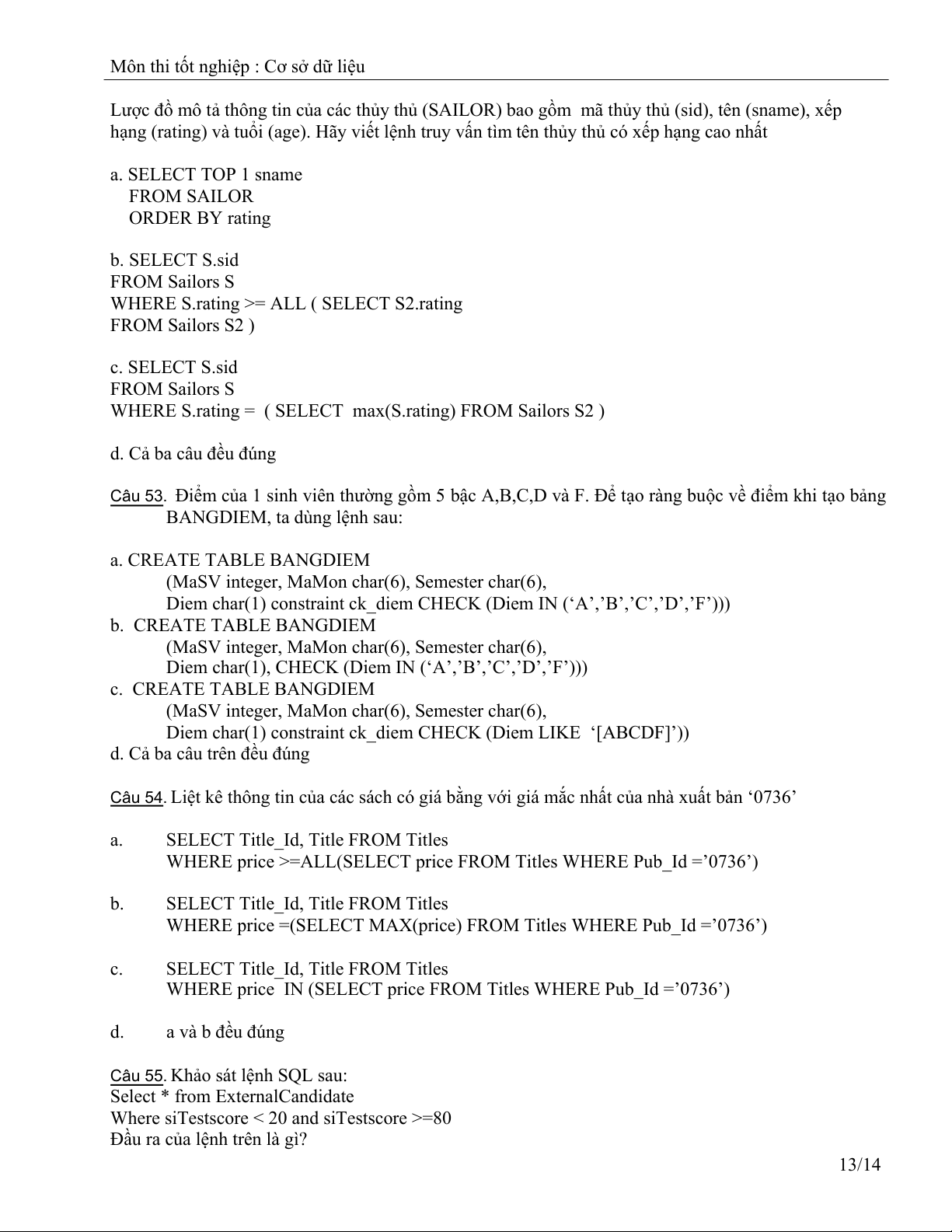 WHERE S.rating = ( SELECT max(S.rating) FROM Sailors S2 ) d. Cả ba câu đều đúng