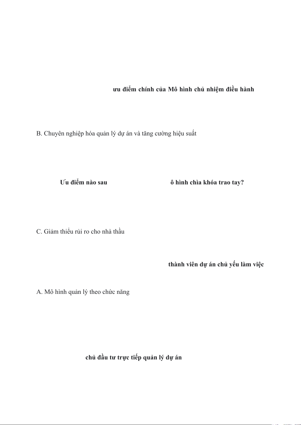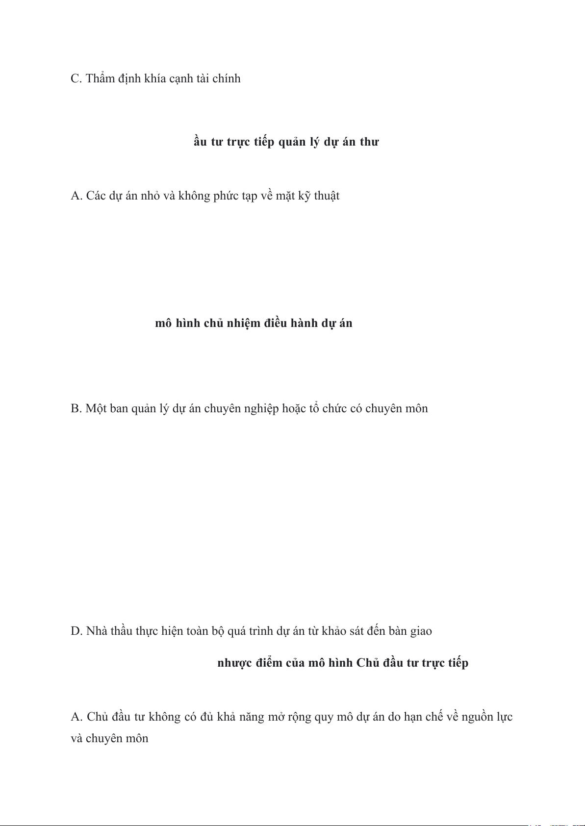 Câu 17: Để giảm thiểu rủi ro khi áp dụng mô hình chủ đầu tư trực tiếp quản lý