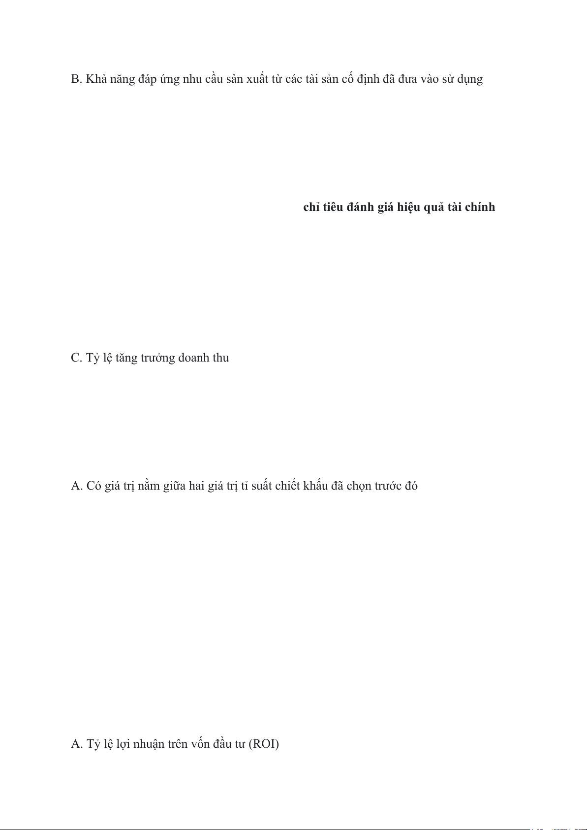 Câu 6: Chỉ tiêu nào dưới đây được sử dụng để đo lường khả năng sinh lời của dự án đầu tư?