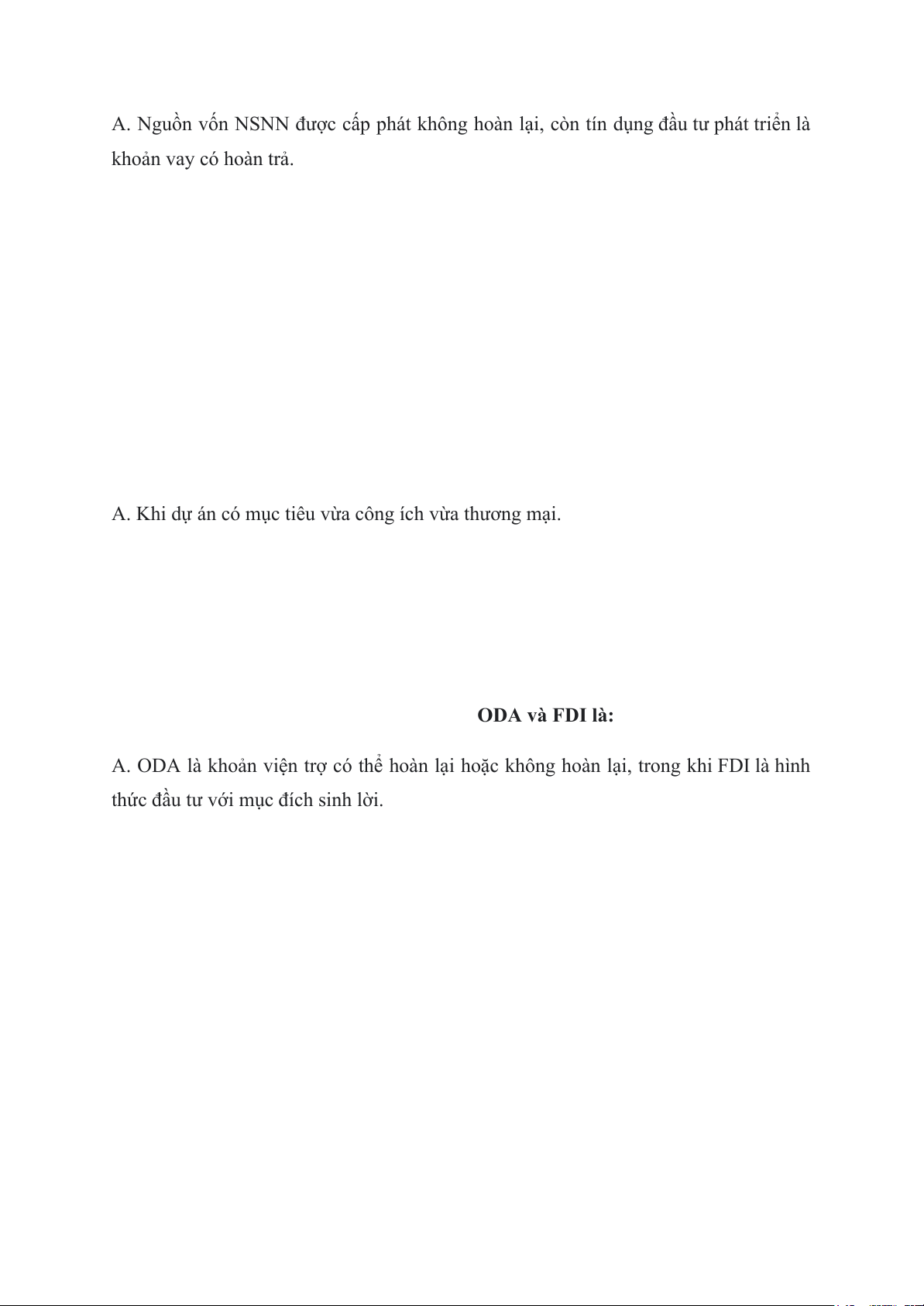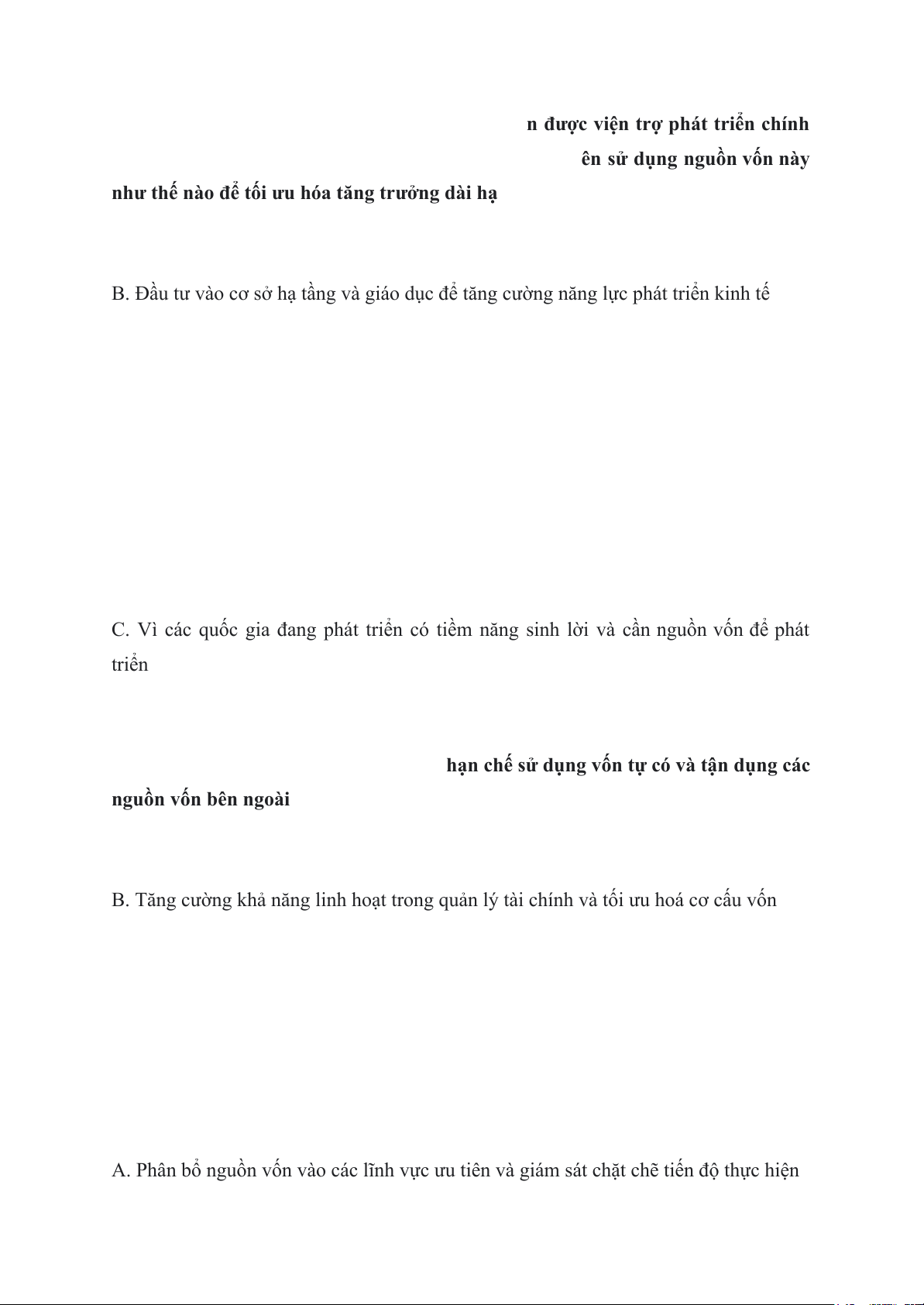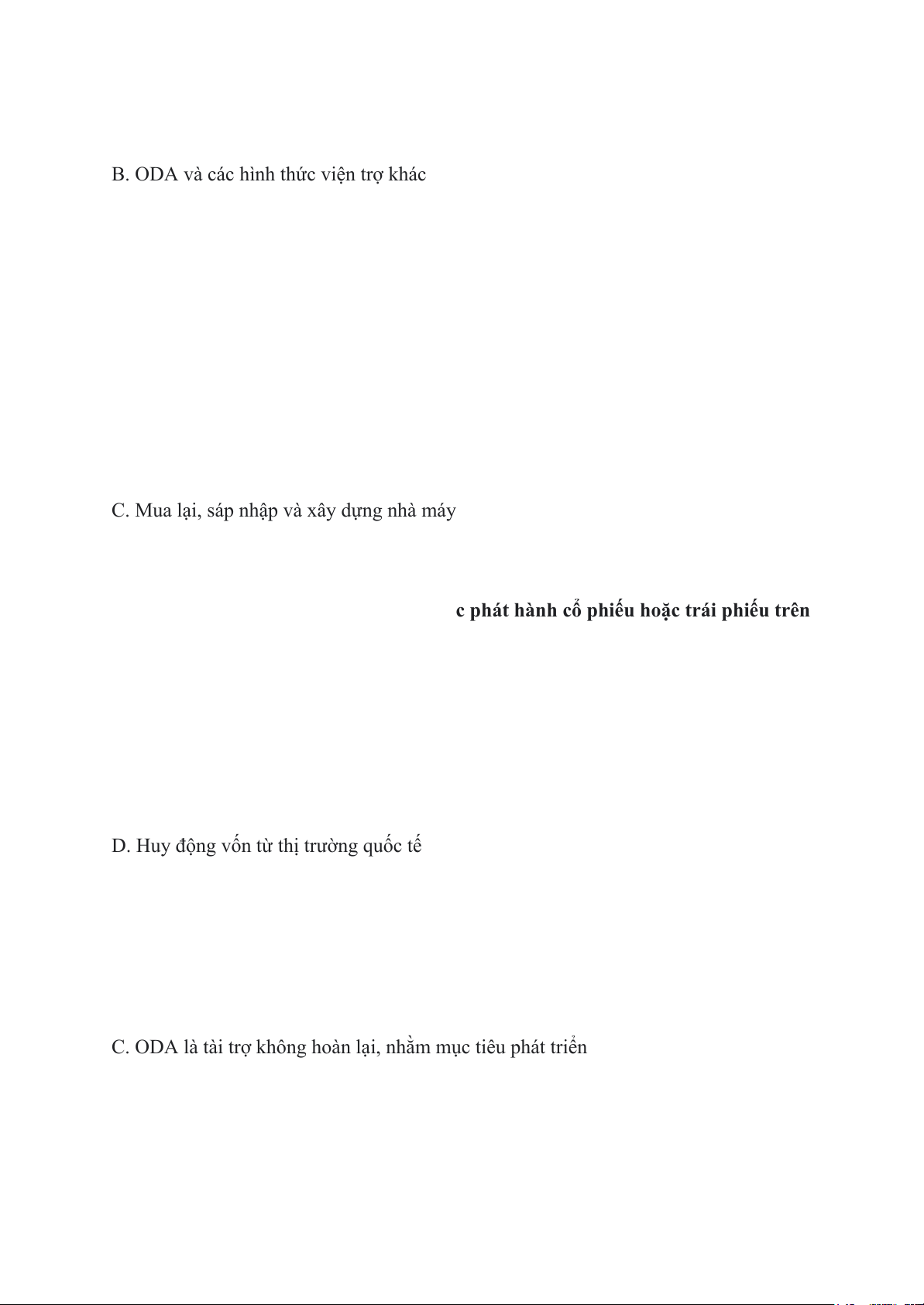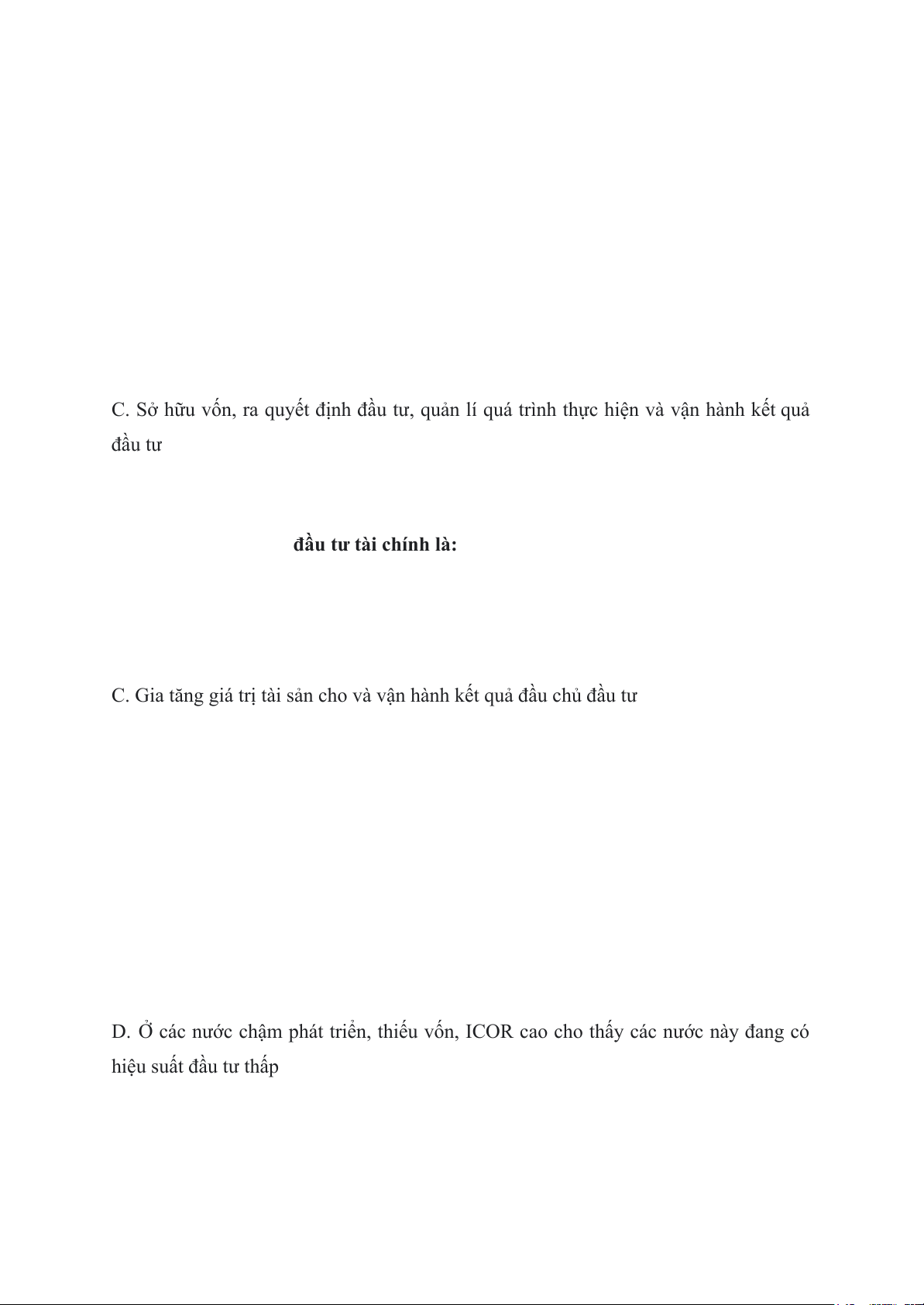 Câu 6: Đầu tư phát triển là một phương thức của: A. Đầu tư dịch chuyển B. Đầu tư trực tiếp C. Đầu tư dài hạn D. Đầu tư sản xuất