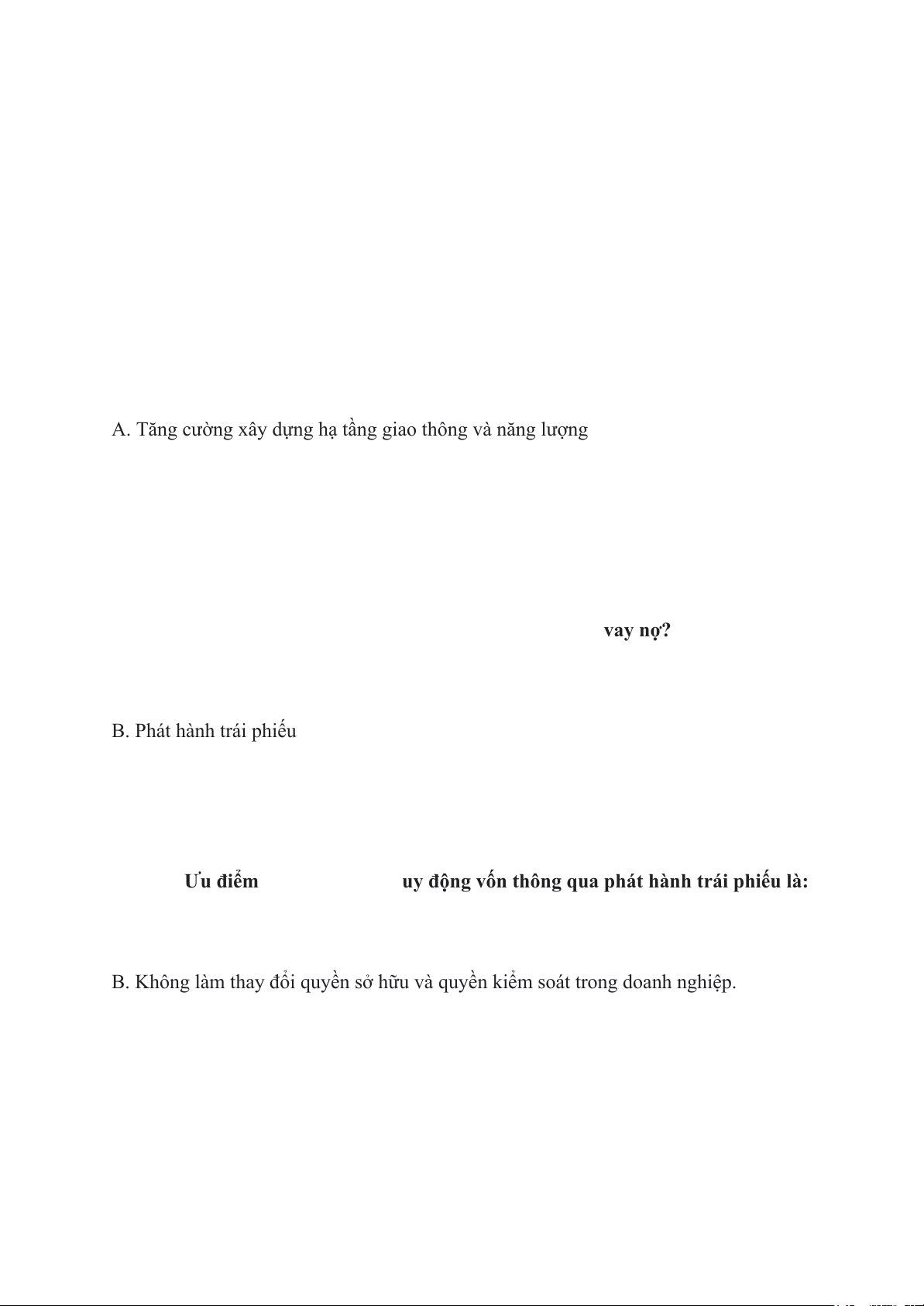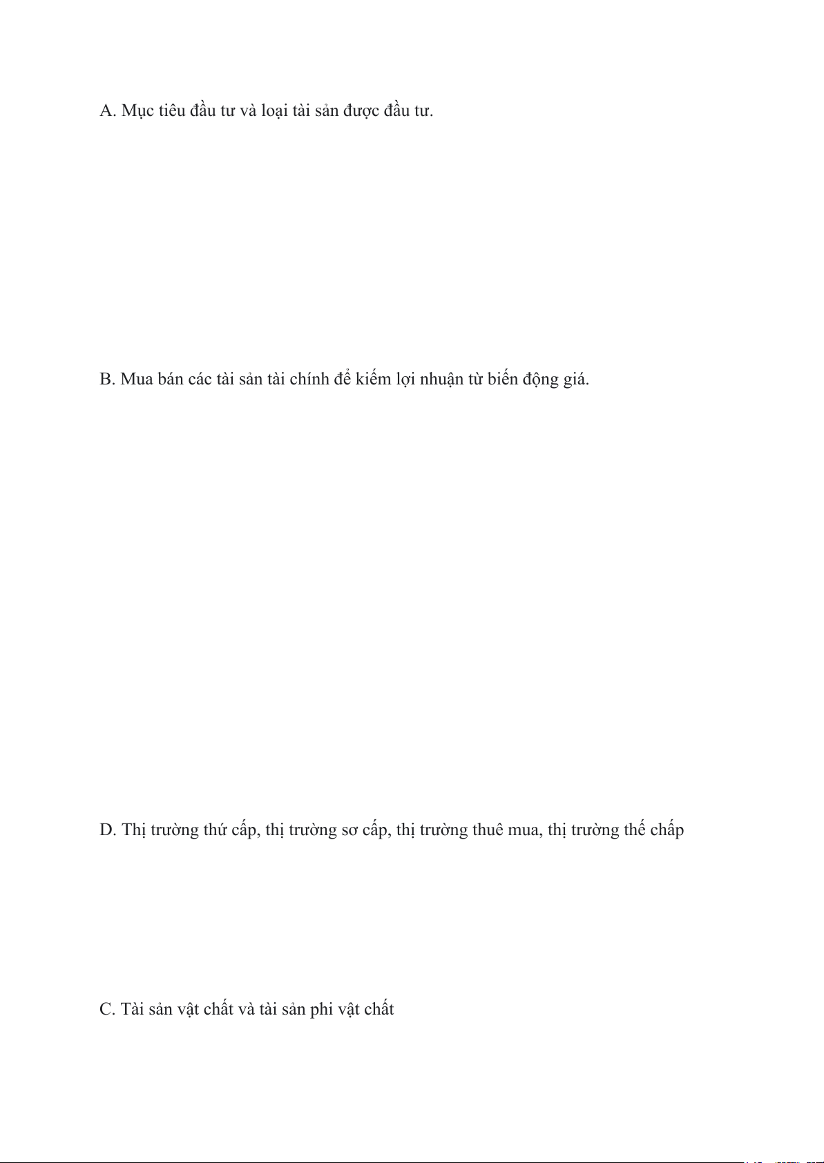 Câu 7: Đầu tư chứng khoán là một phương thức của: A. Đầu tư dịch chuyển B. Đầu tư trực tiếp C. Đầu tư dài hạn D. Đầu tư sản xuất