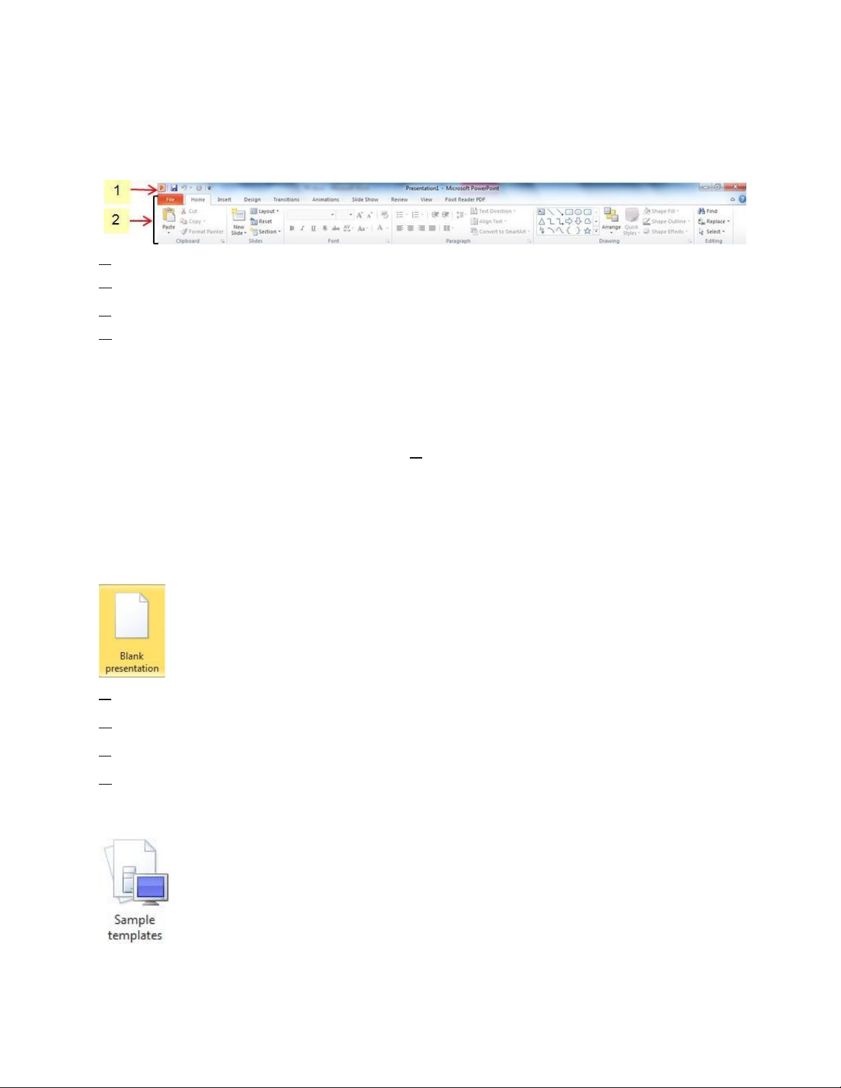Câu 7.14. Thành phần 1, 2 trong cửa sổ làm việc của Ms PowerPoint 2010 bên dưới có tên gọi lần lượt là gì?