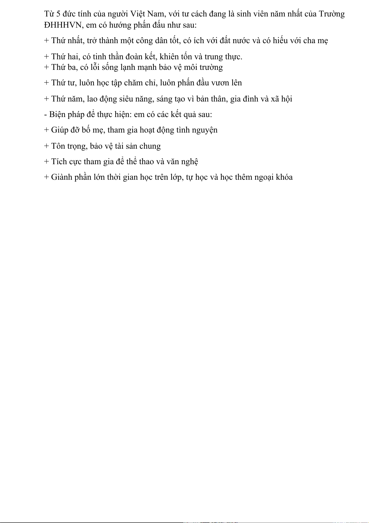 Từ 5 đức tính của người Việt Nam, với tư cách đang là sinh viên năm nhất của Trường