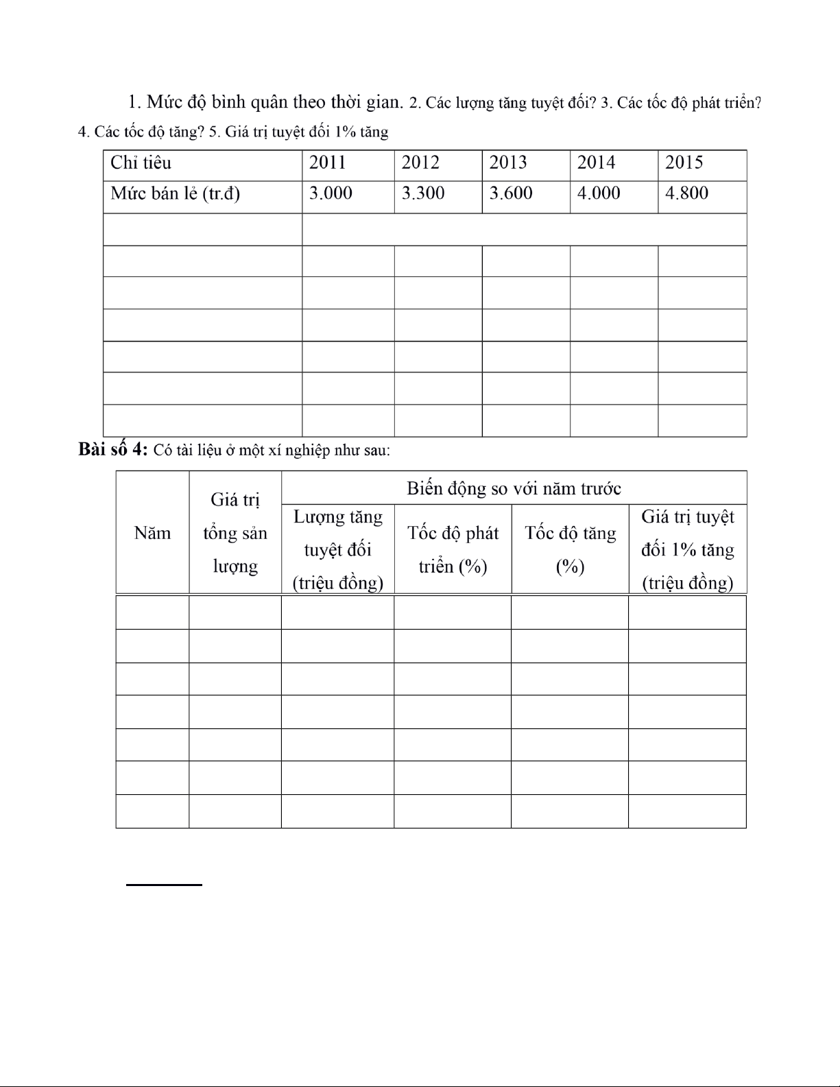 Bài số 3: Mức lưu chuyển Hàng hóa bán lẻ của môt công ty như sau:̣ Chỉ tiêu 2011 2012 2013 2014 2015 Mức bán lẻ 3.000 3.300 3.600 4.000 4.800