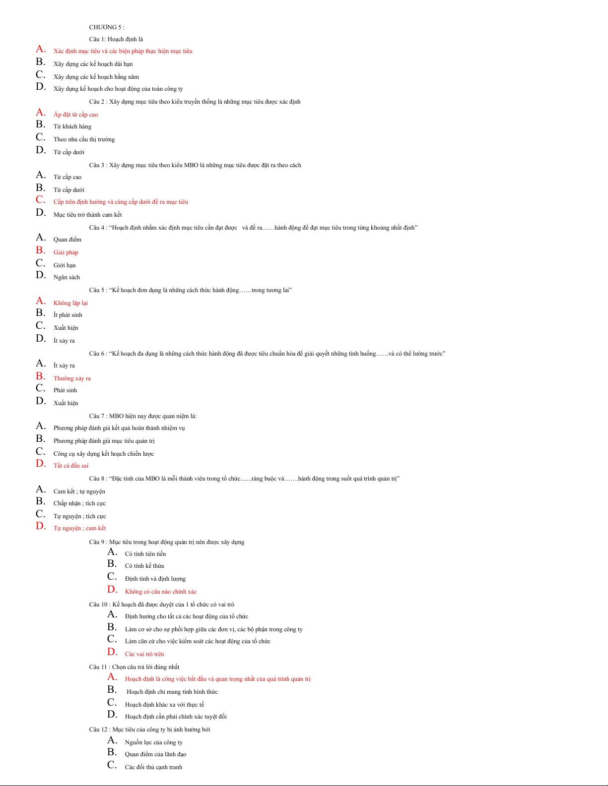 Câu 8 : “Đặc tính của MBO là mỗi thành viên trong tổ chức.......ràng buộc và…….hành động trong suốt quá trình quản trị” A. Cam kết ; tự nguyện B. Chấp nhận ; tích cực