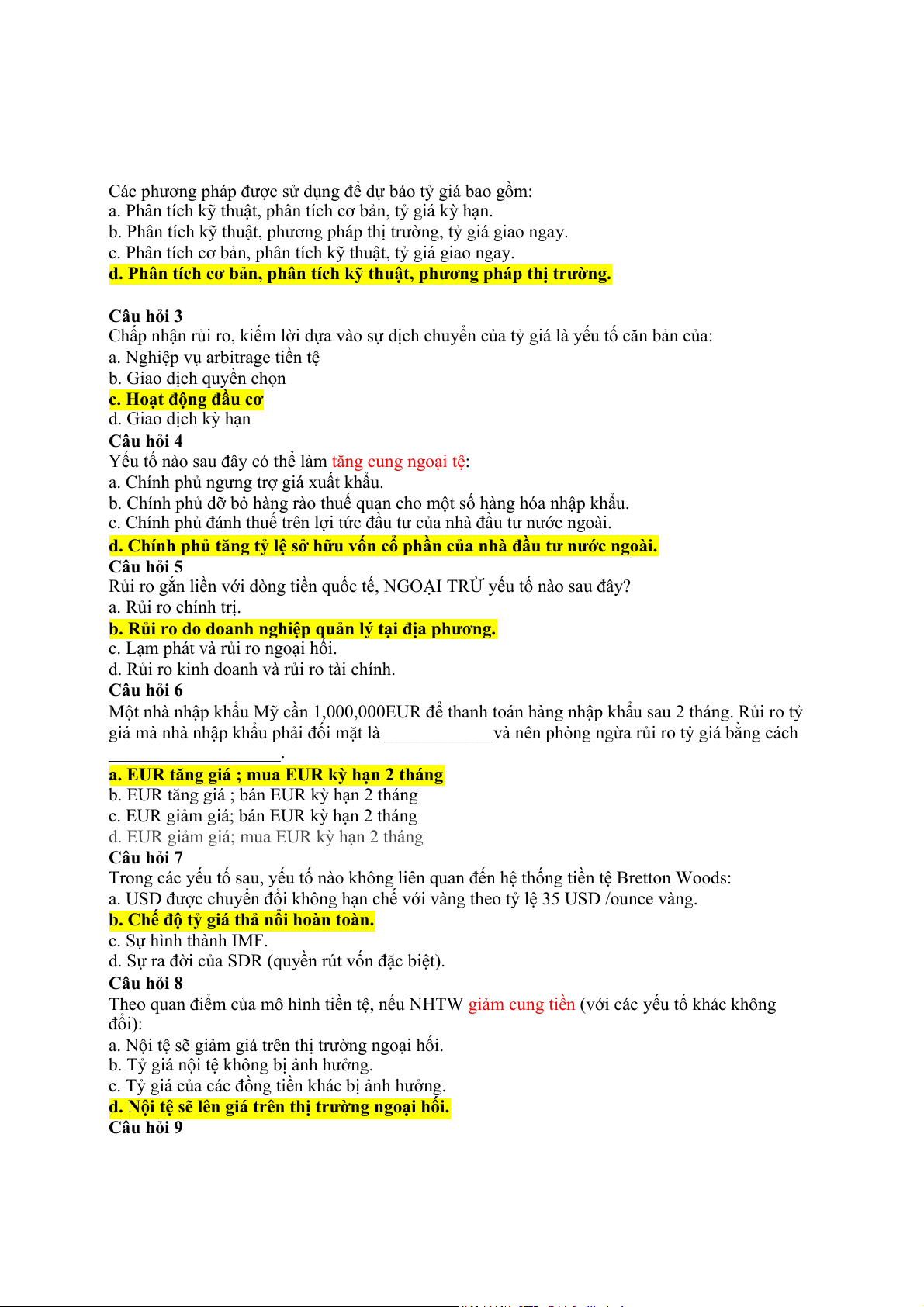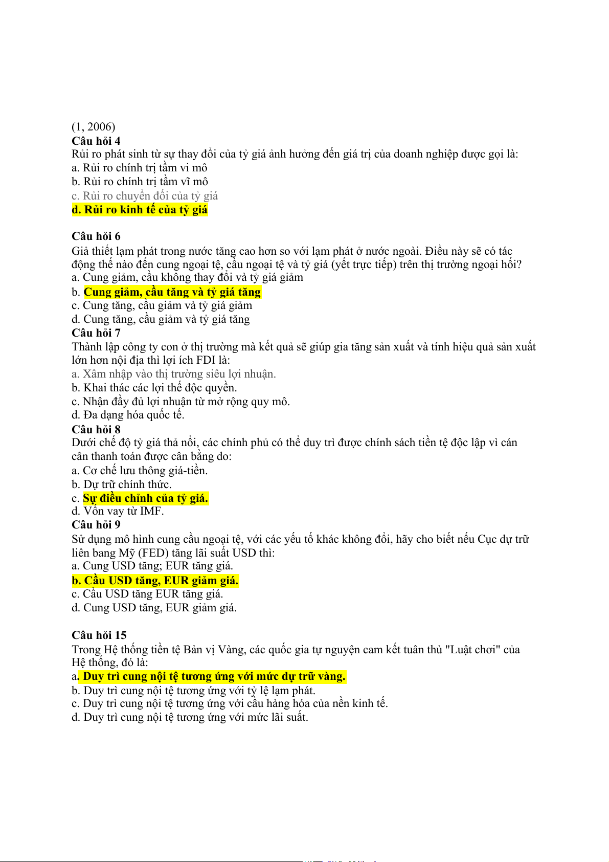 d. Cung USD tăng, EUR giảm giá. Câu hỏi 15
