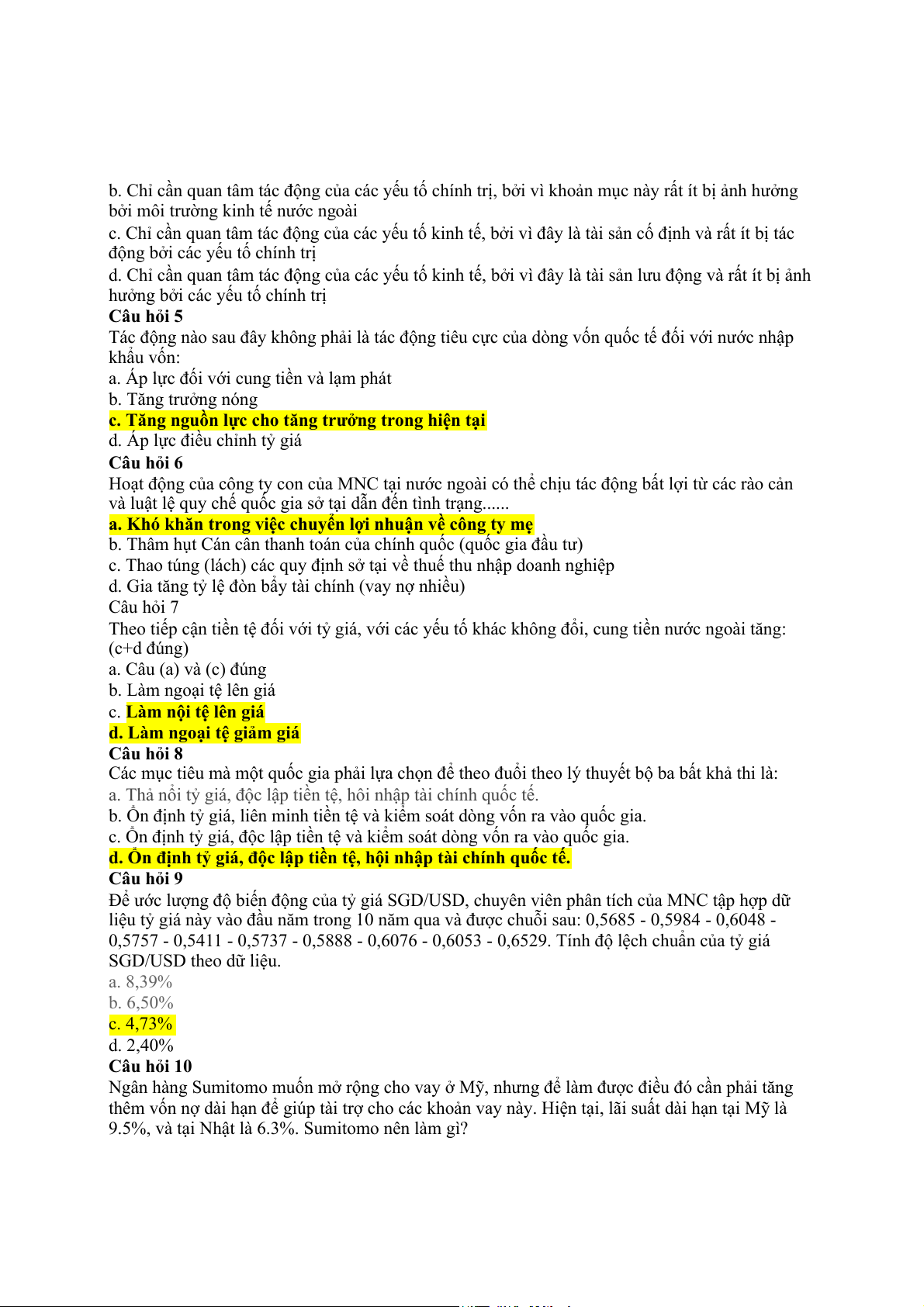 d. Ổn định tỷ giá, độc lập tiền tệ, hội nhập tài chính quốc tế. Câu hỏi 9