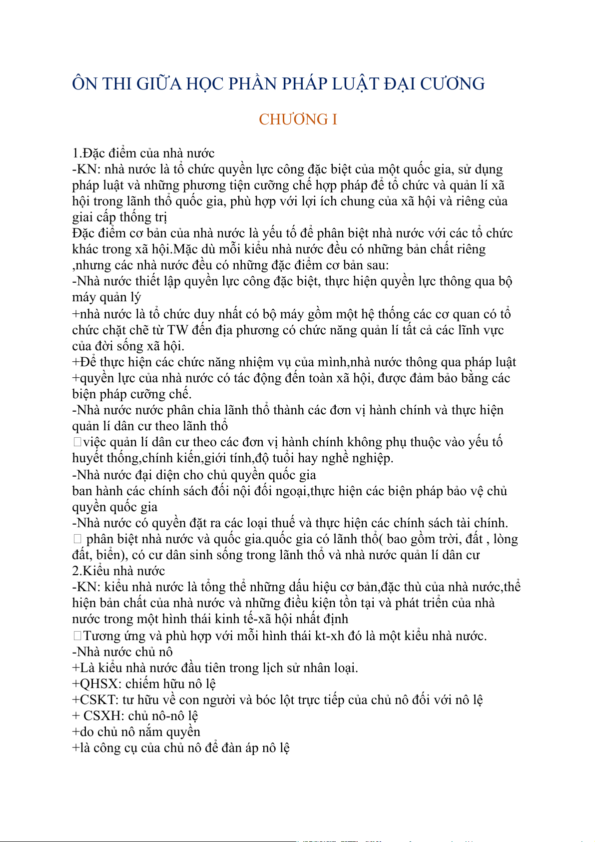 ÔN THI GIỮA HỌC PHẦN PHÁP LUẬT ĐẠI CƯƠNG CHƯƠNG I