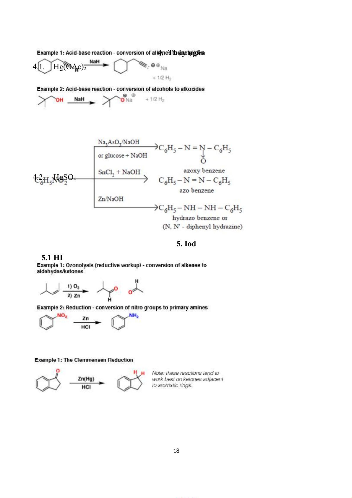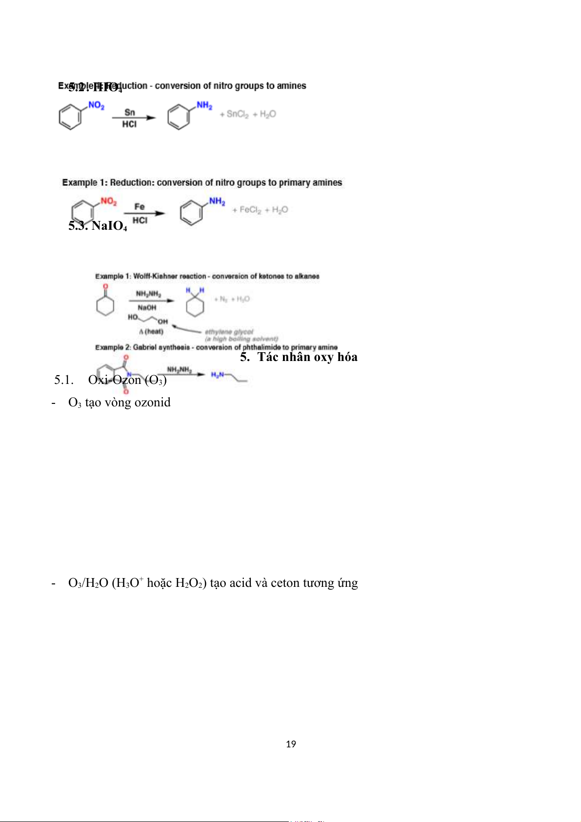 Chú ý phân biệt với R-NH2/R-NH-NH2/NH2-NH-CO-NH2 là p.ư ngưng tụ 16 17 4. Thủy ngân 4.1. Hg(OAc)2 4.2. HgSO4 5. Iod 5.1 HI 18 5.2. HIO4 5.3. NaIO4 5. Tác nhân oxy hóa 5.1. Oxi-Ozon (O3) - O3 tạo vòng ozonid - O +