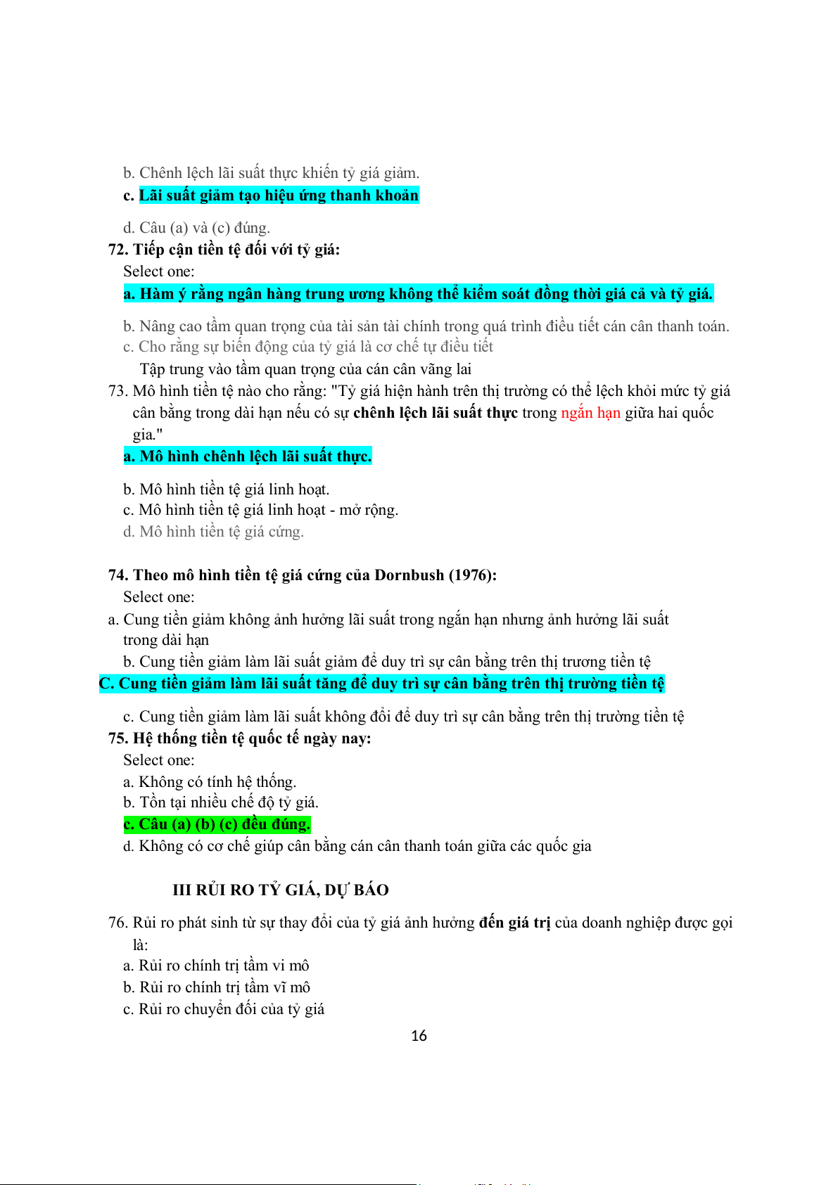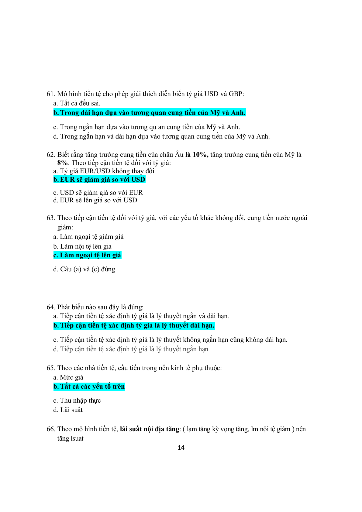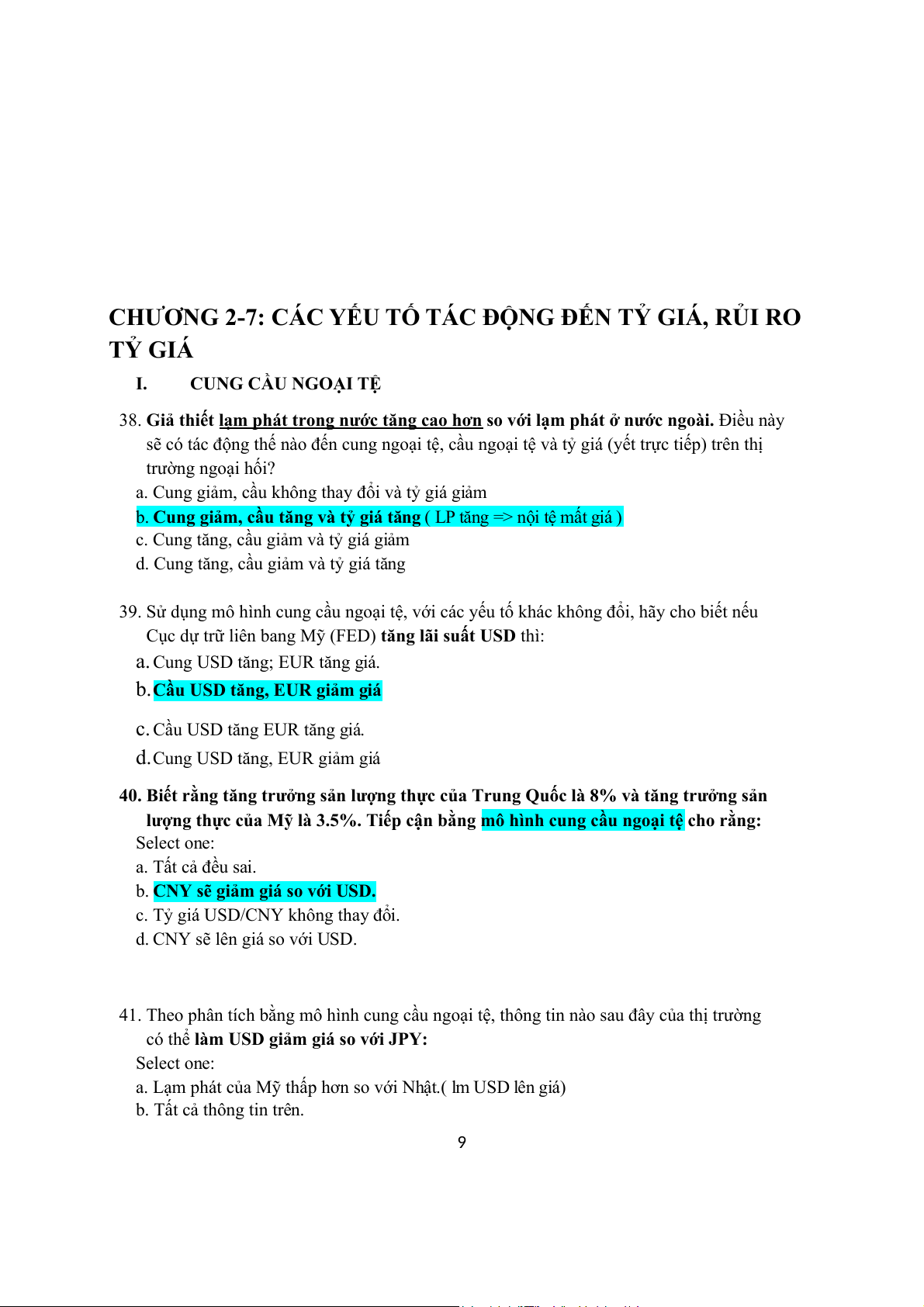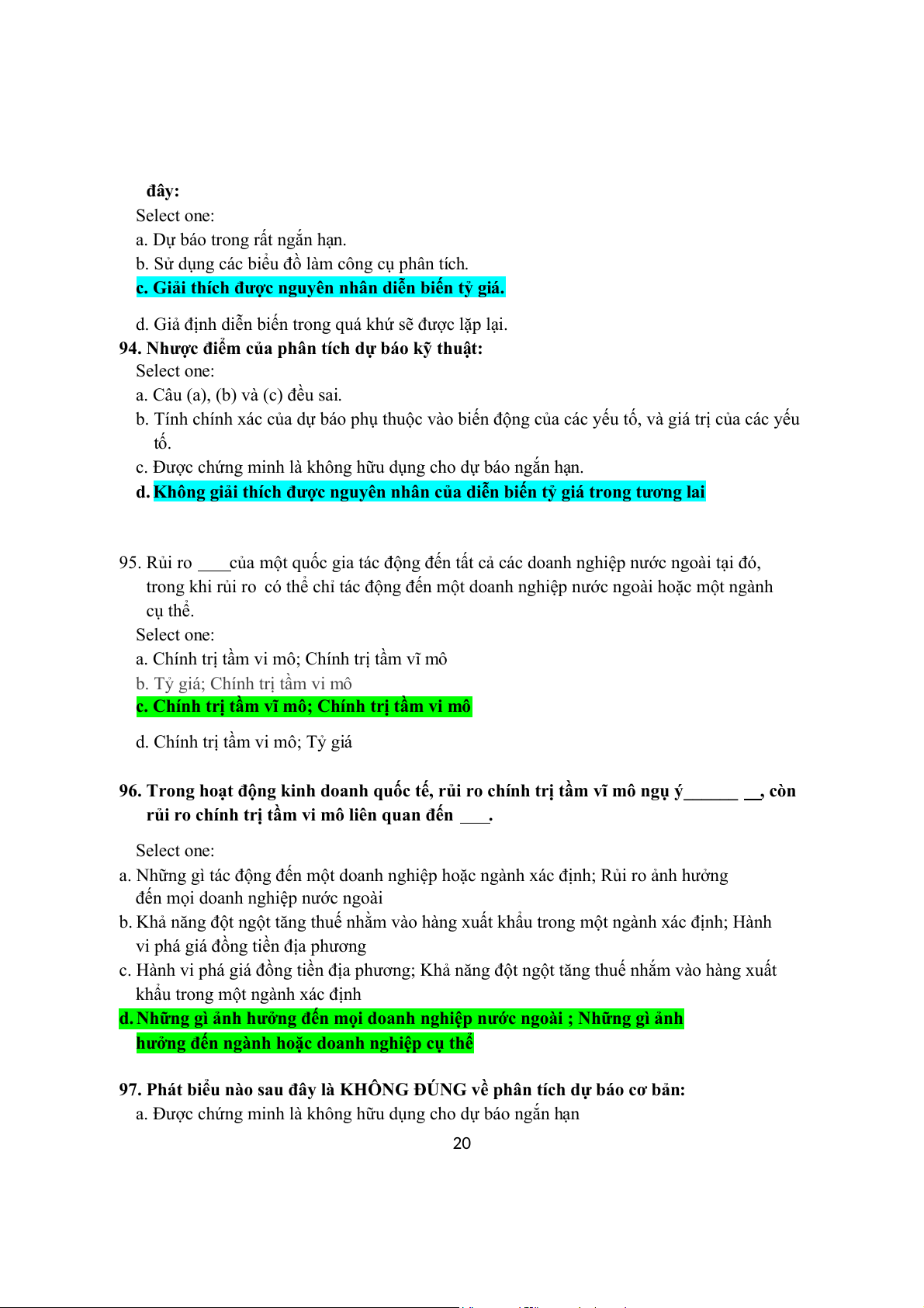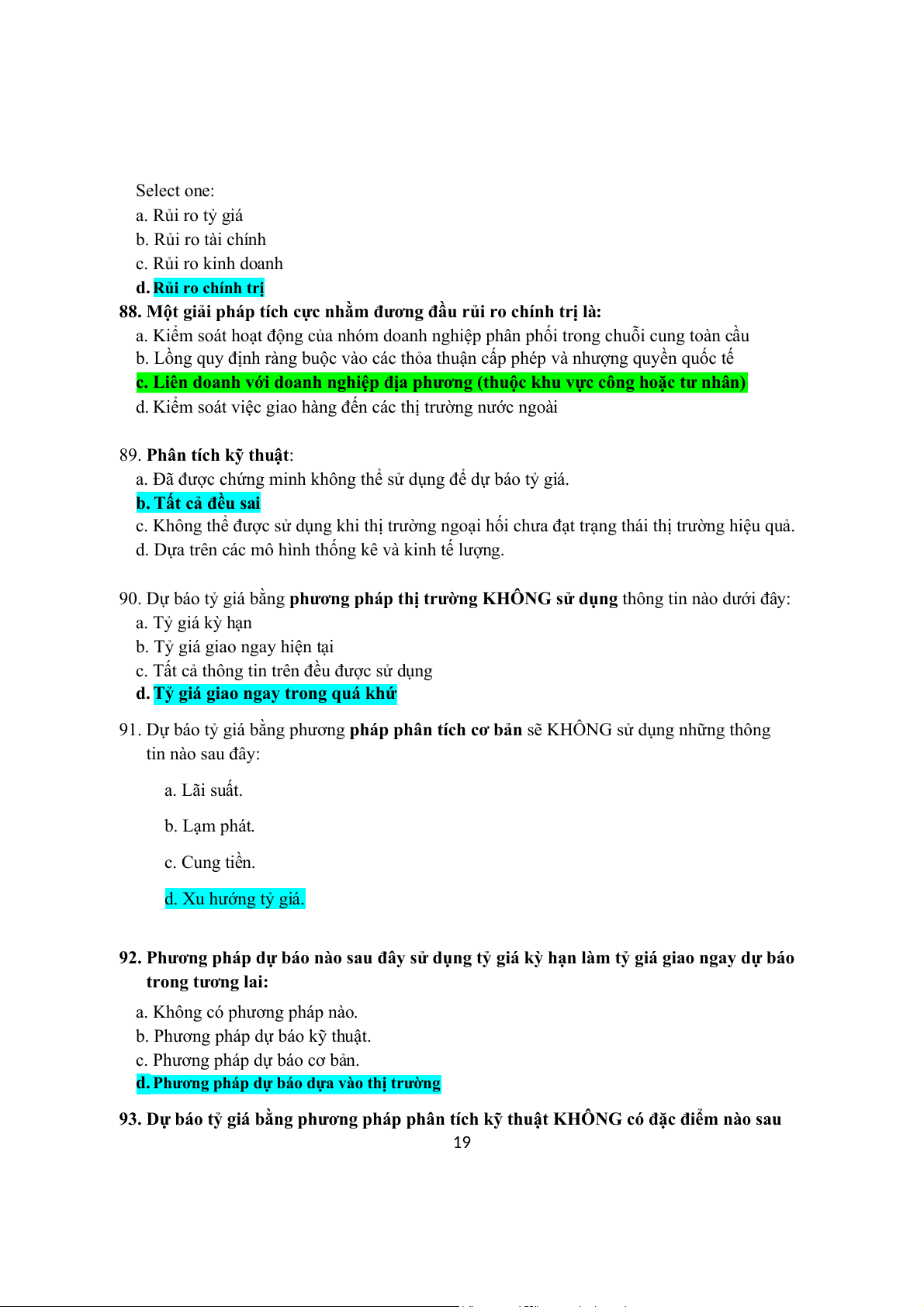 91. Dự báo tỷ giá bằng phương pháp phân tích cơ bản sẽ KHÔNG sử dụng những thông tin nào sau đây: a. Lãi suất. b. Lạm phát. c. Cung tiền. d. Xu hướng tỷ giá.