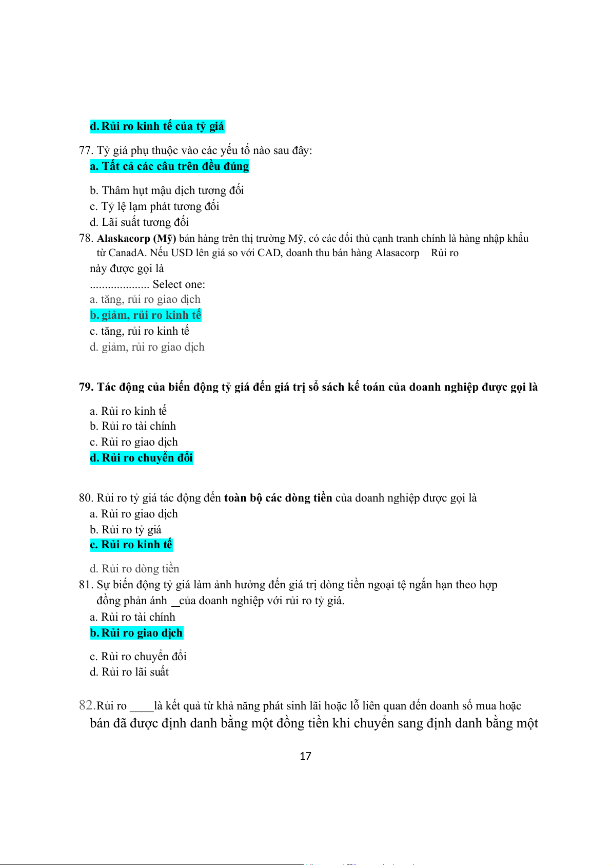 79. Tác động của biến động tỷ giá đến giá trị sổ sách kế toán của doanh nghiệp được gọi là a. Rủi ro kinh tế b. Rủi ro tài chính c. Rủi ro giao dịch