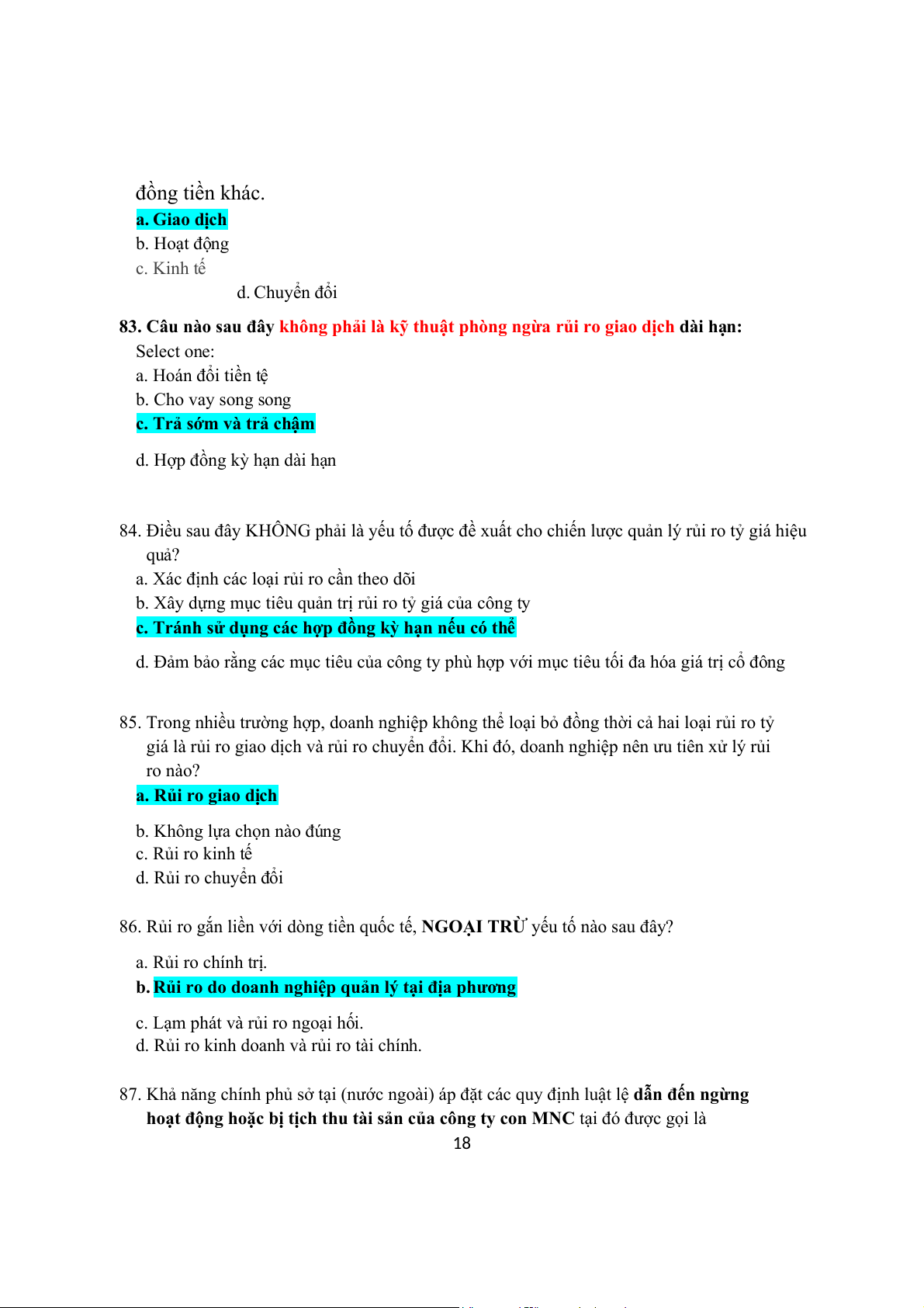 86. Rủi ro gắn liền với dòng tiền quốc tế, yếu tố nào sau đây NGOẠI TRỪ ? a. Rủi ro chính trị.