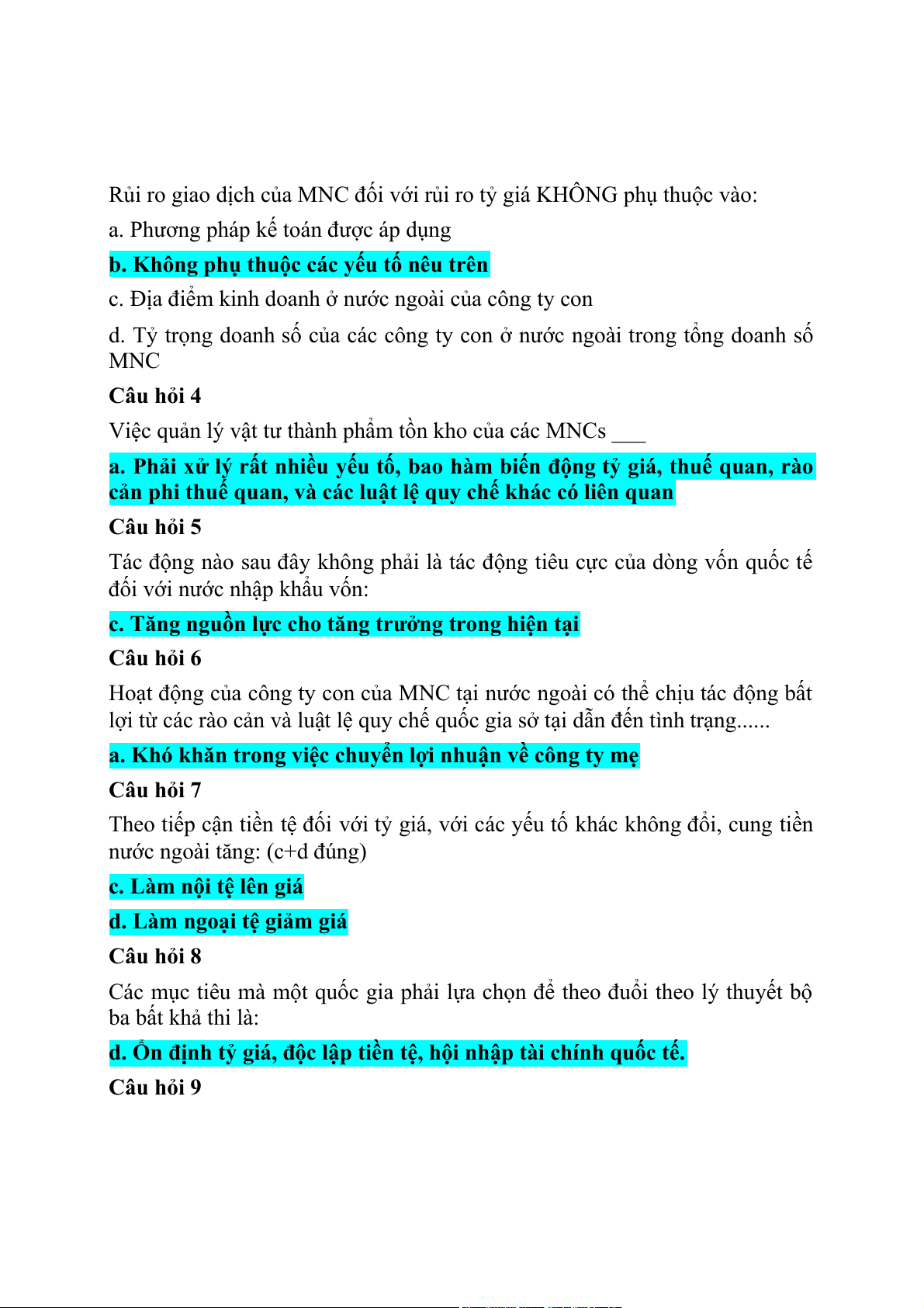 d. Ổn định tỷ giá, độc lập tiền tệ, hội nhập tài chính quốc tế. Câu hỏi 9