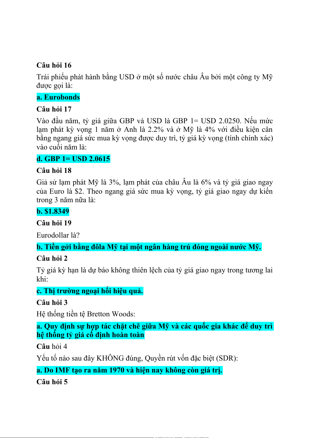 bằng ngang giá sức mua kỳ vọng được duy trì, tỷ giá kỳ vọng (tính chính xác) vào cuối năm là: d. GBP 1= USD 2.0615 Câu hỏi 18