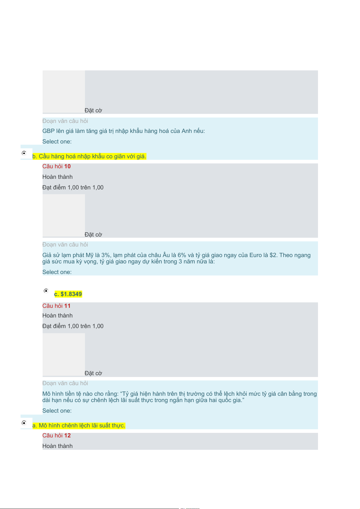 giá sức mua kỳ vọng, tỷ giá giao ngay dự kiến trong 3 năm nữa là: Select one: c.$1.8349 Câu hỏi 11 Hoàn thành Đạt điểm 1,00 trên 1,00 Đặt cờ Đoạn văn câu hỏi