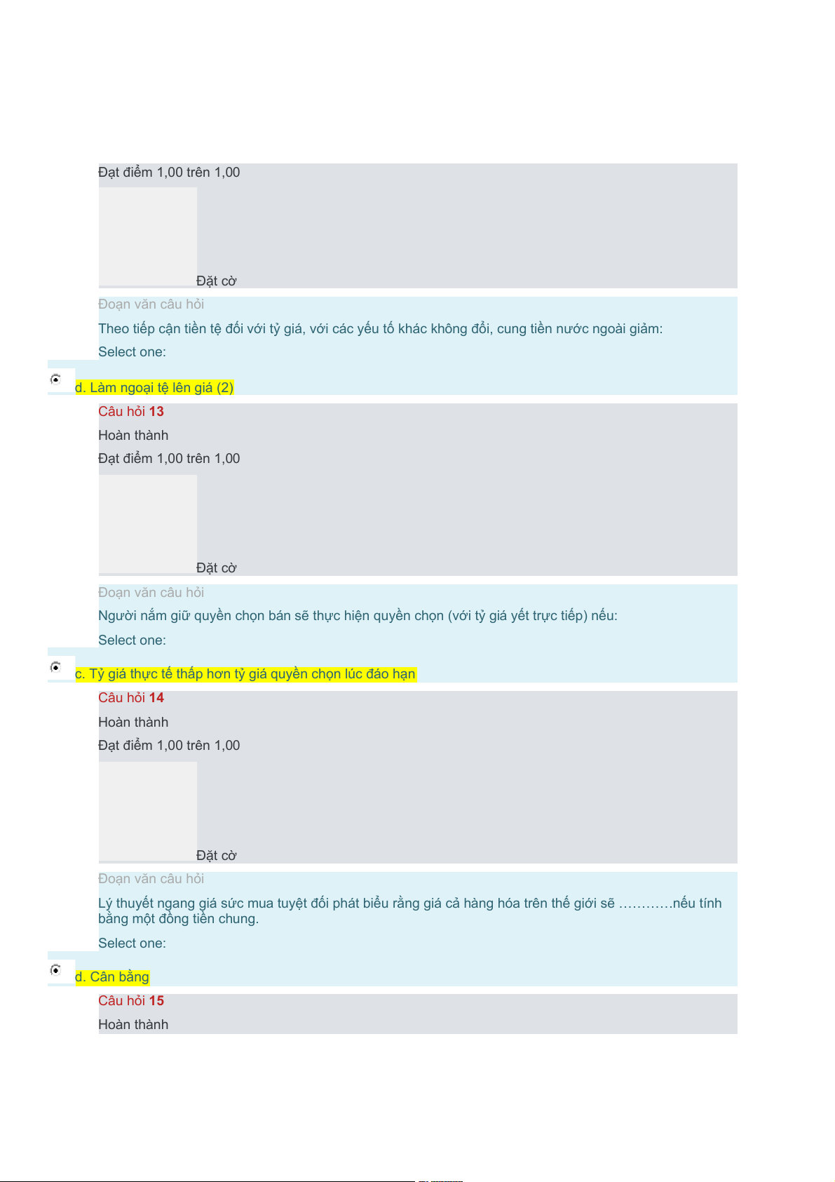 d. Làm ngoại tệ lên giá (2) Câu hỏi 13 Hoàn thành Đạt điểm 1,00 trên 1,00 Đặt cờ Đoạn văn câu hỏi