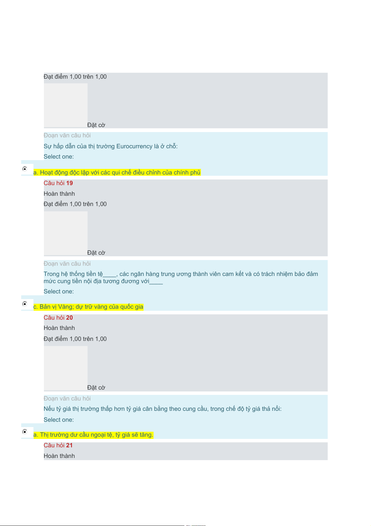 được định giá……….. so với đô la Mỹ là_……….. %. Select one: b. Cao; 13.70% Câu hỏi 9 Hoàn thành Đạt điểm 1,00 trên 1,00 Đặt cờ Đoạn văn câu hỏi