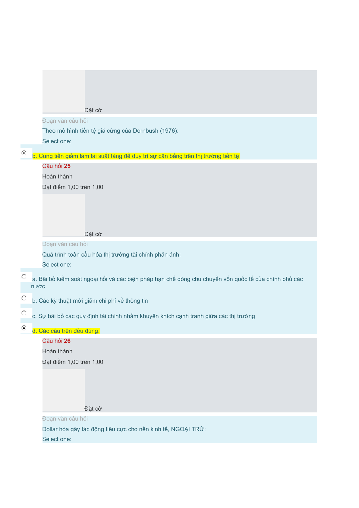 b. Cung tiền giảm làm lãi suất tăng để duy trì sự cân bằng trên thị trường tiền tệ Câu hỏi 25 Hoàn thành Đạt điểm 1,00 trên 1,00 Đặt cờ Đoạn văn câu hỏi