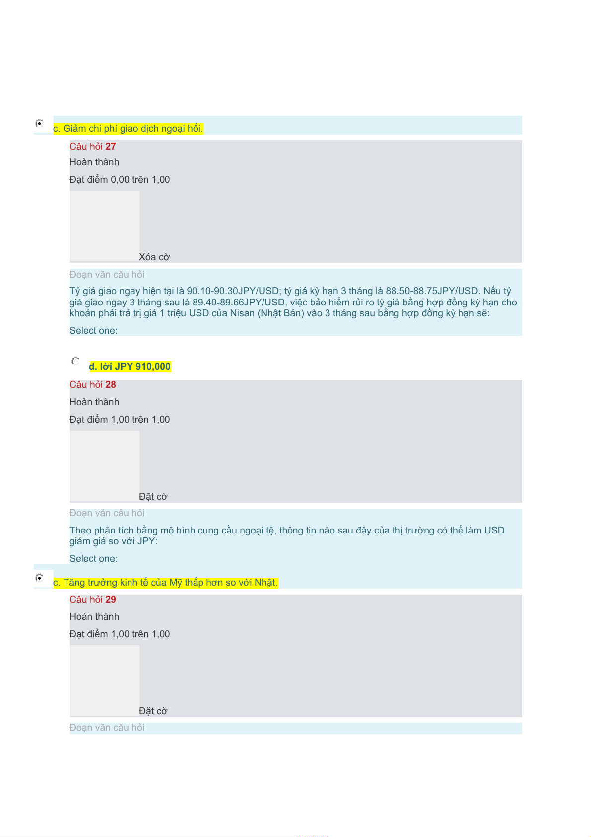 c. Giảm chi phí giao dịch ngoại hối. Câu hỏi 27 Hoàn thành Đạt điểm 0,00 trên 1,00 Xóa cờ Đoạn văn câu hỏi