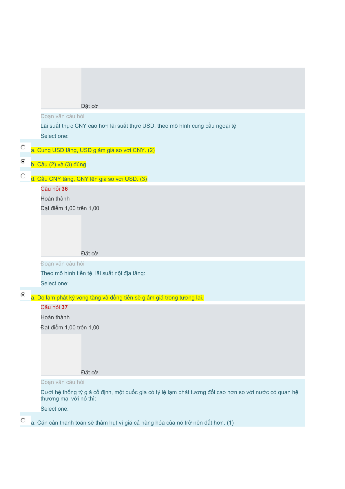 d. Cầu CNY tăng, CNY lên giá so với USD. (3) Câu hỏi 36 Hoàn thành Đạt điểm 1,00 trên 1,00 Đặt cờ Đoạn văn câu hỏi