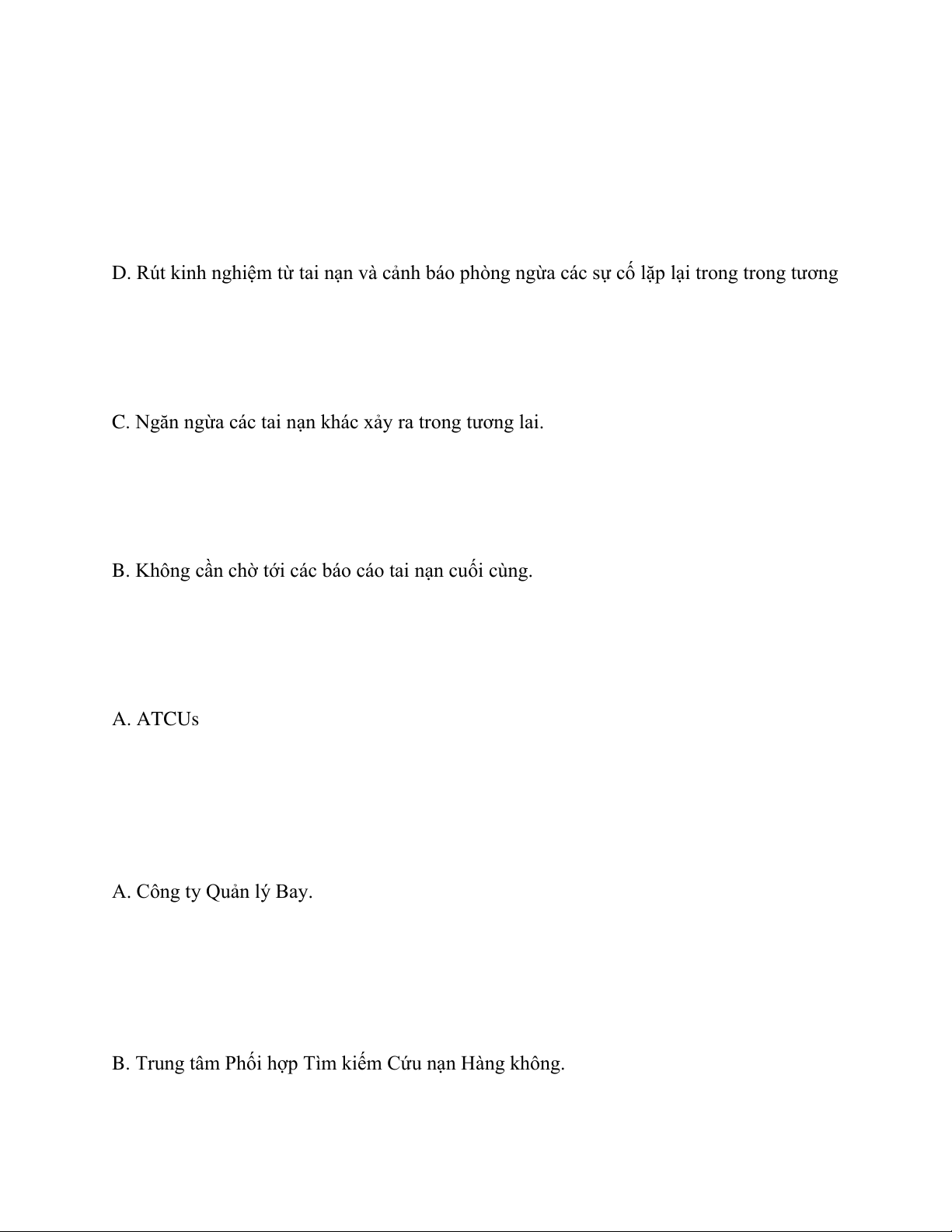 xác định giai đoạn khẩn nguy (phase) để có hỗ trợ kịp thời? A. ATCUs B. SARs C. RCC D. Tất cả đều sai. 5.