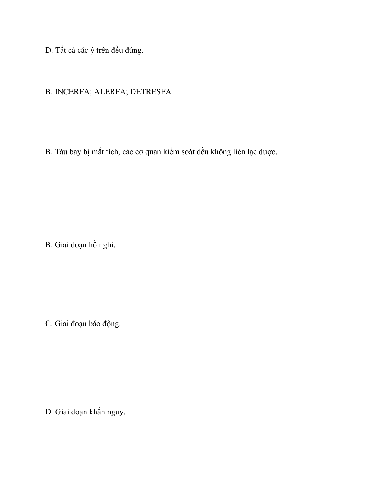 tàu bay sẽ thuộc giai đoạn nào sau đây? A. Giai đoạn đề phòng. B. Giai đoạn hồ nghi. C. Giai đoạn báo động. D. Giai đoạn khẩn nguy. 18.