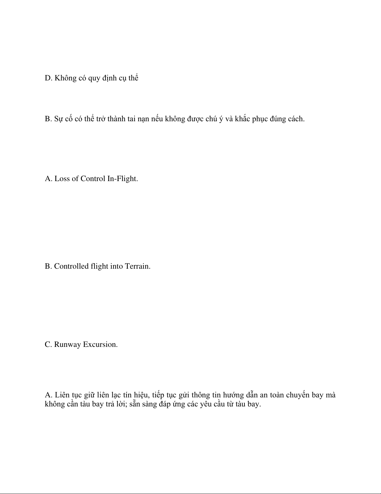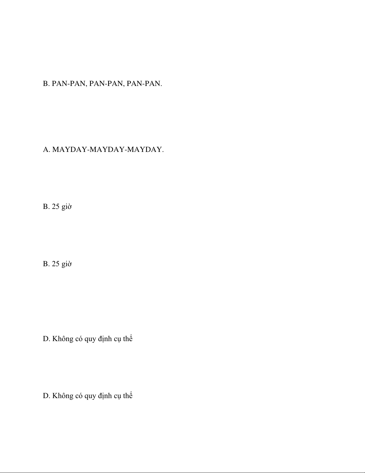 công sẽ phát tín hiệu nào sau đây để được đơn vị liên quan hỗ trợ khắc phục sự cố xảy ra ngay lập tức? A. MAYDAY-MAYDAY-MAYDAY. B. PAN-PAN, PAN-PAN, PAN-PAN. C. ALERT- ALERT- ALERT. D. INCERF- INCERF- INCERF. 20.