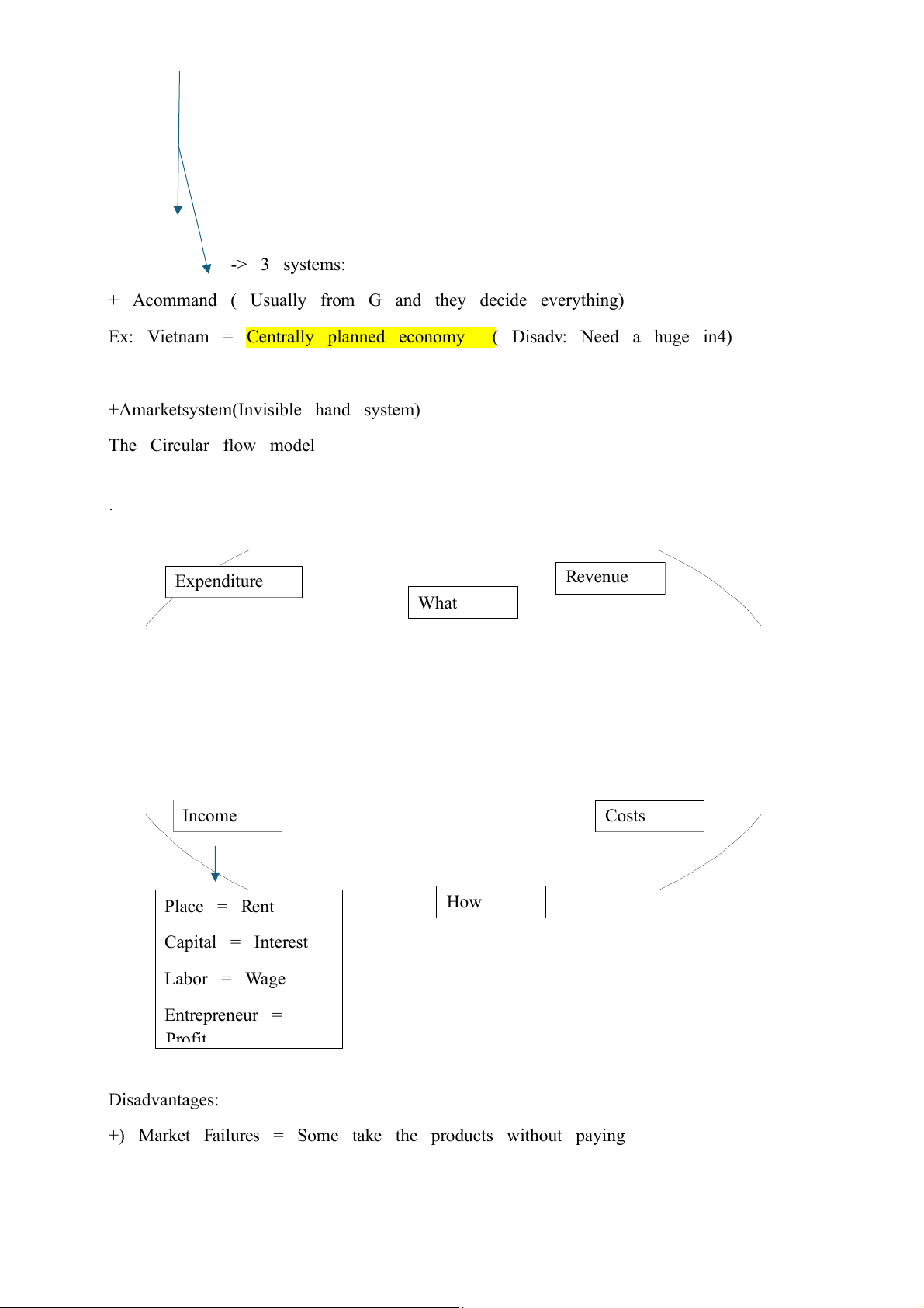 + A market system (Invisible hand system) The Circular flow model ar G se kF pro r e m Htaao vi ctd nr H dc mo fu k S /er s ct isoo Fs Revenue Expenditure What Income Costs How Place = Rent Capital = Interest Labor = Wage Entrepreneur = Profit Disadvantages: