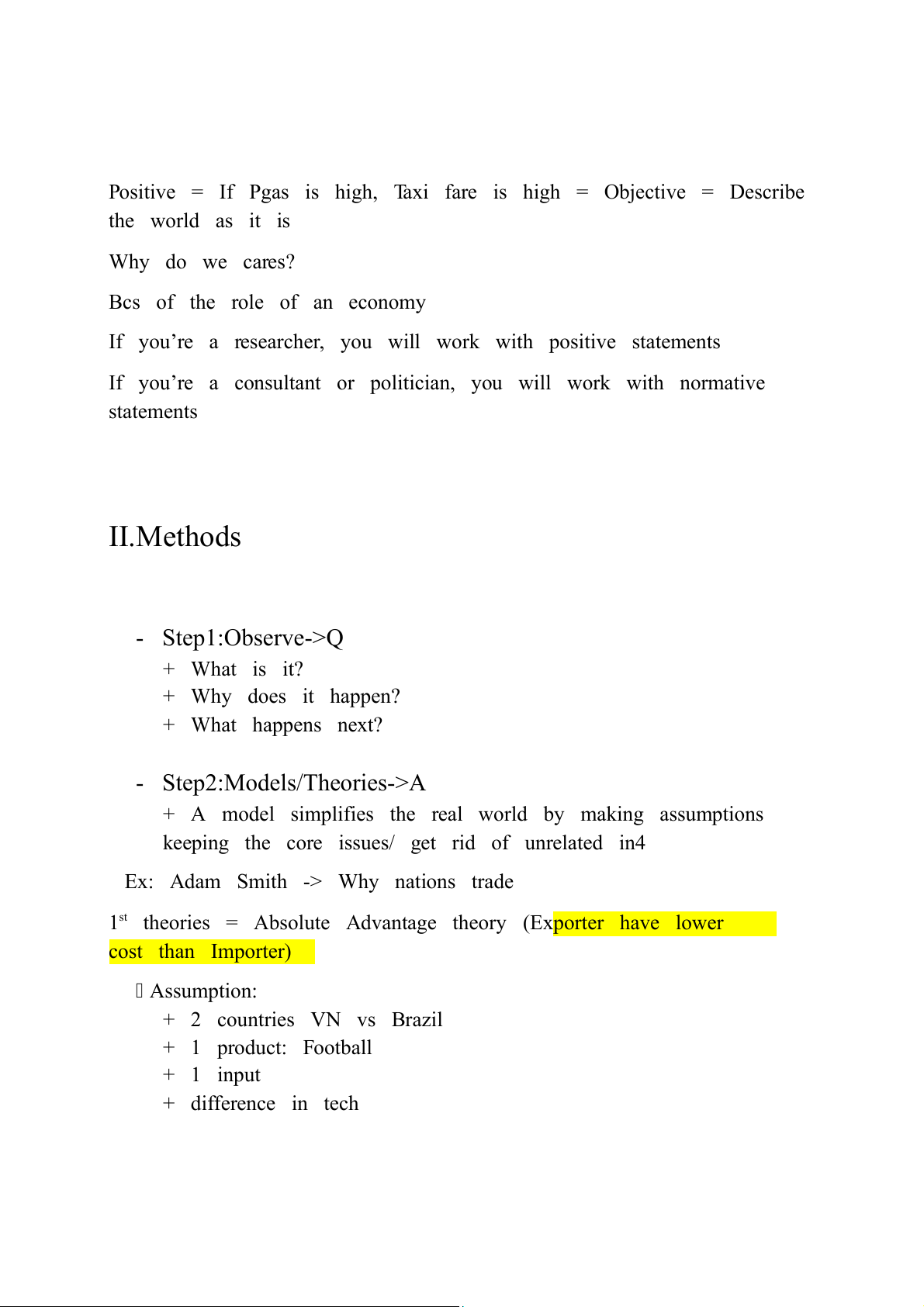 1st theories = Absolute Advantage theory (Exporter have lower cost than Importer) Assumption: + 2 countries VN vs Brazil + 1 product: Football + 1 input + difference in tech Vietnam Brazil Tech Tech < Tech Cost Cost > Cost Product Pfootball > Pfootball Importer Exporter