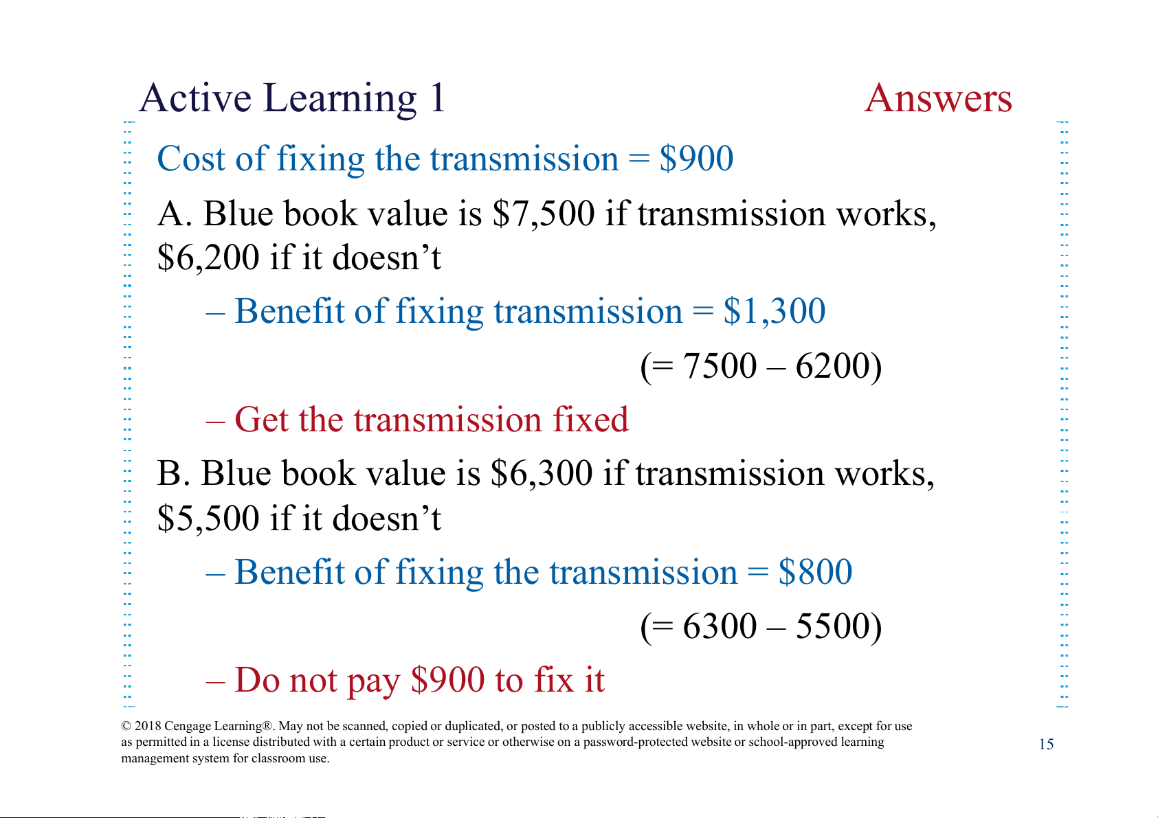 – Benefit of fixing the transmission = $800 (= 6300 – 5500) – Do not pay $900 to fix it