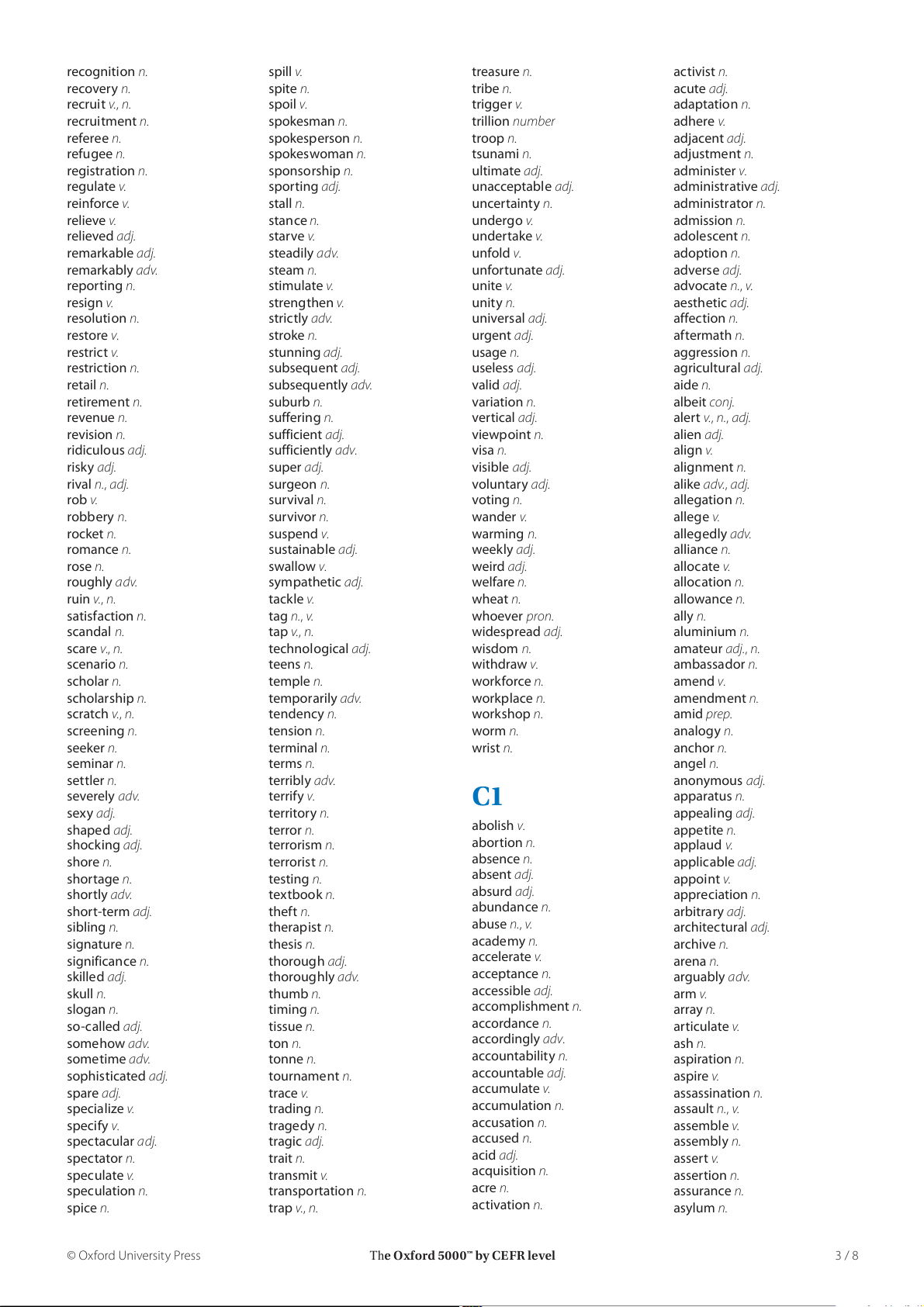 The Oxford 5000™ by CEFR level 2 / 8 recognition n. spill v. treasure n. activist n. recovery n. spite n. tribe n. acute adj. recruit v., n. spoil v. trigger v. adaptation n. recruitment n. spokesman n. trillion number adhere v. referee n. spokesperson n. troop n. adjacent adj. refugee n. spokeswoman n. tsunami n. adjustment n. registration n. sponsorship n. ultimate adj. administer v. regulate v. sporting adj. unacceptable adj. administrative adj. reinforce v. stall n. uncertainty n. administrator n. relieve v. stance n. undergo v. admission n. relieved adj. starve v. undertake v. adolescent n. remarkable adj. steadily adv. unfold v. adoption n. remarkably adv. steam n. unfortunate adj. adverse adj. reporting n. stimulate v. unite v. advocate n., v. resign v. strengthen v. unity n. aesthetic adj. resolution n. strictly adv. universal adj. affection n. restore v. stroke n. urgent adj. aftermath n. restrict v. stunning adj. usage n. aggression n. restriction n. subsequent adj. useless adj. agricultural adj. retail n. subsequently adv. valid adj. aide n. retirement n. suburb n. variation n. albeit conj. revenue n. suffering n. vertical adj. alert v., n., adj. revision n. sufficient adj. viewpoint n. alien adj. ridiculous adj. sufficiently adv. visa n. align v. risky adj. super adj. visible adj. alignment n. rival n., adj. surgeon n. voluntary adj. alike adv., adj. rob v. survival n. voting n. allegation n. robbery n. survivor n. wander v. allege v. rocket n. suspend v. warming n. allegedly adv. romance n. sustainable adj. weekly adj. alliance n. rose n. swallow v. weird adj. allocate v. roughly adv. sympathetic adj. welfare n. allocation n. ruin v., n. tackle v. wheat n. allowance n. satisfaction n. tag n., v. whoever pron. ally n. scandal n. tap v., n. widespread adj. aluminium n. scare v., n. technological adj. wisdom n. amateur adj., n. scenario n. teens n. withdraw v. ambassador n. scholar n. temple n. workforce n. amend v. scholarship n. temporarily adv. workplace n. amendment n. scratch v., n. tendency n. workshop n. amid prep. screening n. tension n. worm n. analogy n. seeker n. terminal n. wrist n. anchor n. seminar n. terms n. angel n. settler n. terribly adv. anonymous adj. severely adv. terrify v. C1 apparatus n. sexy adj. territory n. appealing adj. shaped adj. terror n. abolish v. appetite n. shocking adj. terrorism n. abortion n. applaud v. shore n. terrorist n. absence n. applicable adj. shortage n. testing n. absent adj. appoint v. shortly adv. textbook n. absurd adj. appreciation n. short-term adj. theft n. abundance n. arbitrary adj. sibling n. therapist n. abuse n., v. architectural adj. signature n. thesis n. academy n. archive n. significance n. thorough adj. accelerate v. arena n. skilled adj. thoroughly adv. acceptance n. arguably adv. skull n. thumb n. accessible adj. arm v. slogan n. timing n. accomplishment n. array n. so-called adj. tissue n. accordance n. articulate v. somehow adv. ton n. accordingly adv. ash n. sometime adv. tonne n. accountability n. aspiration n. sophisticated adj. tournament n. accountable adj. aspire v. spare adj. trace v. accumulate v. assassination n. specialize v. trading n. accumulation n. assault n., v. specify v. tragedy n. accusation n. assemble v. spectacular adj. tragic adj. accused n. assembly n. spectator n. trait n. acid adj. assert v. speculate v. transmit v. acquisition n. assertion n. speculation n. transportation n. acre n. assurance n. spice n. trap v., n. activation n. asylum n. © Oxford University Press