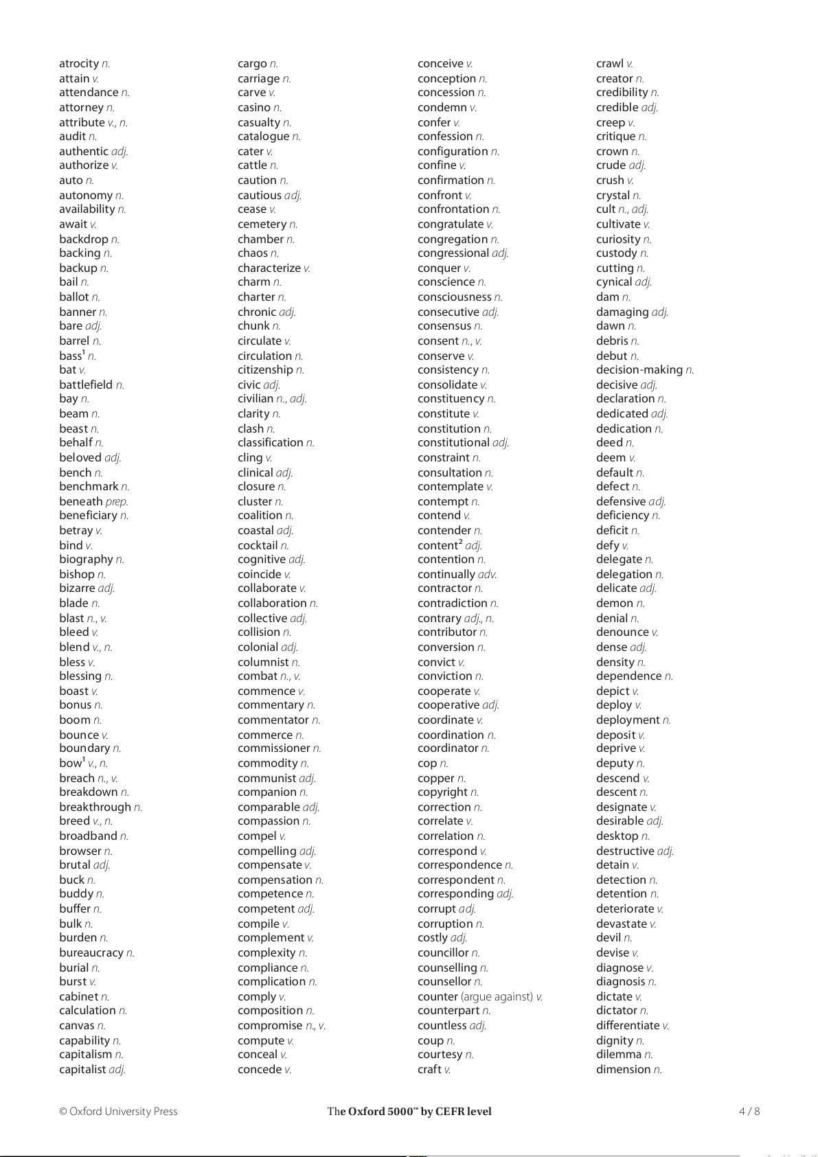 The Oxford 5000™ by CEFR level 3 / 8 atrocity n. cargo n. conceive v. crawl v. attain v. carriage n. conception n. creator n. attendance n. carve v. concession n. credibility n. attorney n. casino n. condemn v. credible adj. attribute v., n. casualty n. confer v. creep v. audit n. catalogue n. confession n. critique n. authentic adj. cater v. configuration n. crown n. authorize v. cattle n. confine v. crude adj. auto n. caution n. confirmation n. crush v. autonomy n. cautious adj. confront v. crystal n. availability n. cease v. confrontation n. cult n., adj. await v. cemetery n. congratulate v. cultivate v. backdrop n. chamber n. congregation n. curiosity n. backing n. chaos n. congressional adj. custody n. backup n. characterize v. conquer v. cutting n. bail n. charm n. conscience n. cynical adj. ballot n. charter n. consciousness n. dam n. banner n. chronic adj. consecutive adj. damaging adj. bare adj. chunk n. consensus n. dawn n. barrel n. circulate v. consent n., v. debris n. bass1 n. circulation n. conserve v. debut n. bat v. citizenship n. consistency n. decision-making n. battlefield n. civic adj. consolidate v. decisive adj. bay n. civilian n., adj. constituency n. declaration n. beam n. clarity n. constitute v. dedicated adj. beast n. clash n. constitution n. dedication n. behalf n. classification n. constitutional adj. deed n. beloved adj. cling v. constraint n. deem v. bench n. clinical adj. consultation n. default n. benchmark n. closure n. contemplate v. defect n. beneath prep. cluster n. contempt n. defensive adj. beneficiary n. coalition n. contend v. deficiency n. betray v. coastal adj. contender n. deficit n. bind v. cocktail n. content2 adj. defy v. biography n. cognitive adj. contention n. delegate n. bishop n. coincide v. continually adv. delegation n. bizarre adj. collaborate v. contractor n. delicate adj. blade n. collaboration n. contradiction n. demon n. blast n., v. collective adj. contrary adj., n. denial n. bleed v. collision n. contributor n. denounce v. blend v., n. colonial adj. conversion n. dense adj. bless v. columnist n. convict v. density n. blessing n. combat n., v. conviction n. dependence n. boast v. commence v. cooperate v. depict v. bonus n. commentary n. cooperative adj. deploy v. boom n. commentator n. coordinate v. deployment n. bounce v. commerce n. coordination n. deposit v. boundary n. commissioner n. coordinator n. deprive v. bow1 v., n. commodity n. cop n. deputy n. breach n., v. communist adj. copper n. descend v. breakdown n. companion n. copyright n. descent n. breakthrough n. comparable adj. correction n. designate v. breed v., n. compassion n. correlate v. desirable adj. broadband n. compel v. correlation n. desktop n. browser n. compelling adj. correspond v. destructive adj. brutal adj. compensate v. correspondence n. detain v. buck n. compensation n. correspondent n. detection n. buddy n. competence n. corresponding adj. detention n. buffer n. competent adj. corrupt adj. deteriorate v. bulk n. compile v. corruption n. devastate v. burden n. complement v. costly adj. devil n. bureaucracy n. complexity n. councillor n. devise v. burial n. compliance n. counselling n. diagnose v. burst v. complication n. counsellor n. diagnosis n. cabinet n. comply v. counter (argue against) v. dictate v. calculation n. composition n. counterpart n. dictator n. canvas n. compromise n., v. countless adj. differentiate v. capability n. compute v. coup n. dignity n. capitalism n. conceal v. courtesy n. dilemma n. capitalist adj. concede v. craft v. dimension n. © Oxford University Press