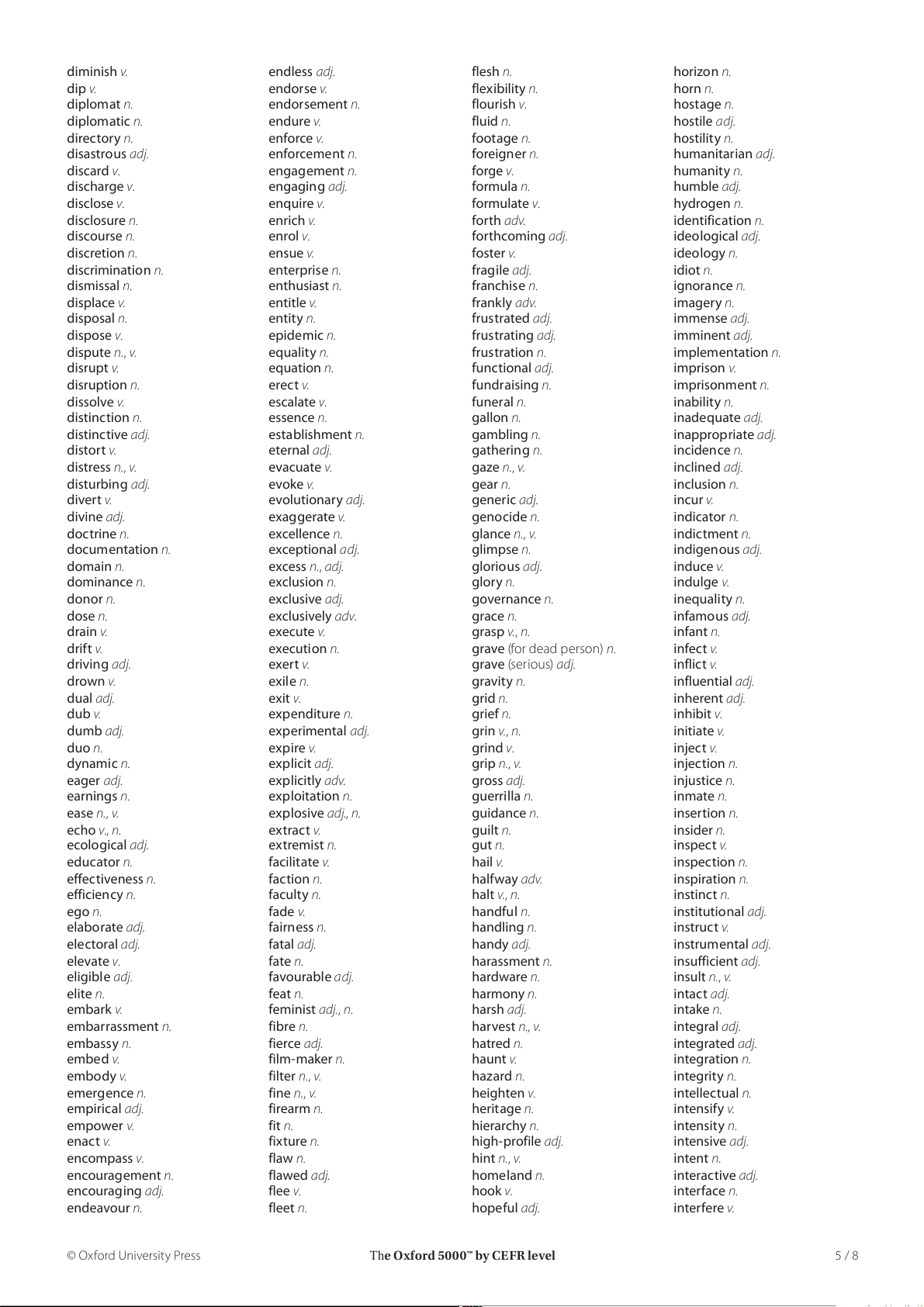 The Oxford 5000™ by CEFR level 4 / 8 diminish v. endless adj. flesh n. horizon n. dip v. endorse v. flexibility n. horn n. diplomat n. endorsement n. flourish v. hostage n. diplomatic n. endure v. fluid n. hostile adj. directory n. enforce v. footage n. hostility n. disastrous adj. enforcement n. foreigner n. humanitarian adj. discard v. engagement n. forge v. humanity n. discharge v. engaging adj. formula n. humble adj. disclose v. enquire v. formulate v. hydrogen n. disclosure n. enrich v. forth adv. identification n. discourse n. enrol v. forthcoming adj. ideological adj. discretion n. ensue v. foster v. ideology n. discrimination n. enterprise n. fragile adj. idiot n. dismissal n. enthusiast n. franchise n. ignorance n. displace v. entitle v. frankly adv. imagery n. disposal n. entity n. frustrated adj. immense adj. dispose v. epidemic n. frustrating adj. imminent adj. dispute n., v. equality n. frustration n. implementation n. disrupt v. equation n. functional adj. imprison v. disruption n. erect v. fundraising n. imprisonment n. dissolve v. escalate v. funeral n. inability n. distinction n. essence n. gallon n. inadequate adj. distinctive adj. establishment n. gambling n. inappropriate adj. distort v. eternal adj. gathering n. incidence n. distress n., v. evacuate v. gaze n., v. inclined adj. disturbing adj. evoke v. gear n. inclusion n. divert v. evolutionary adj. generic adj. incur v. divine adj. exaggerate v. genocide n. indicator n. doctrine n. excellence n. glance n., v. indictment n. documentation n. exceptional adj. glimpse n. indigenous adj. domain n. excess n., adj. glorious adj. induce v. dominance n. exclusion n. glory n. indulge v. donor n. exclusive adj. governance n. inequality n. dose n. exclusively adv. grace n. infamous adj. drain v. execute v. grasp v., n. infant n. drift v. execution n. grave (for dead person) n. infect v. driving adj. exert v. grave (serious) adj. inflict v. drown v. exile n. gravity n. influential adj. dual adj. exit v. grid n. inherent adj. dub v. expenditure n. grief n. inhibit v. dumb adj. experimental adj. grin v., n. initiate v. duo n. expire v. grind v. inject v. dynamic n. explicit adj. grip n., v. injection n. eager adj. explicitly adv. gross adj. injustice n. earnings n. exploitation n. guerrilla n. inmate n. ease n., v. explosive adj., n. guidance n. insertion n. echo v., n. extract v. guilt n. insider n. ecological adj. extremist n. gut n. inspect v. educator n. facilitate v. hail v. inspection n. effectiveness n. faction n. halfway adv. inspiration n. efficiency n. faculty n. halt v., n. instinct n. ego n. fade v. handful n. institutional adj. elaborate adj. fairness n. handling n. instruct v. electoral adj. fatal adj. handy adj. instrumental adj. elevate v. fate n. harassment n. insufficient adj. eligible adj. favourable adj. hardware n. insult n., v. elite n. feat n. harmony n. intact adj. embark v. feminist adj., n. harsh adj. intake n. embarrassment n. fibre n. harvest n., v. integral adj. embassy n. fierce adj. hatred n. integrated adj. embed v. film-maker n. haunt v. integration n. embody v. filter n., v. hazard n. integrity n. emergence n. fine n., v. heighten v. intellectual n. empirical adj. firearm n. heritage n. intensify v. empower v. fit n. hierarchy n. intensity n. enact v. fixture n. high-profile adj. intensive adj. encompass v. flaw n. hint n., v. intent n. encouragement n. flawed adj. homeland n. interactive adj. encouraging adj. flee v. hook v. interface n. endeavour n. fleet n. hopeful adj. interfere v. © Oxford University Press