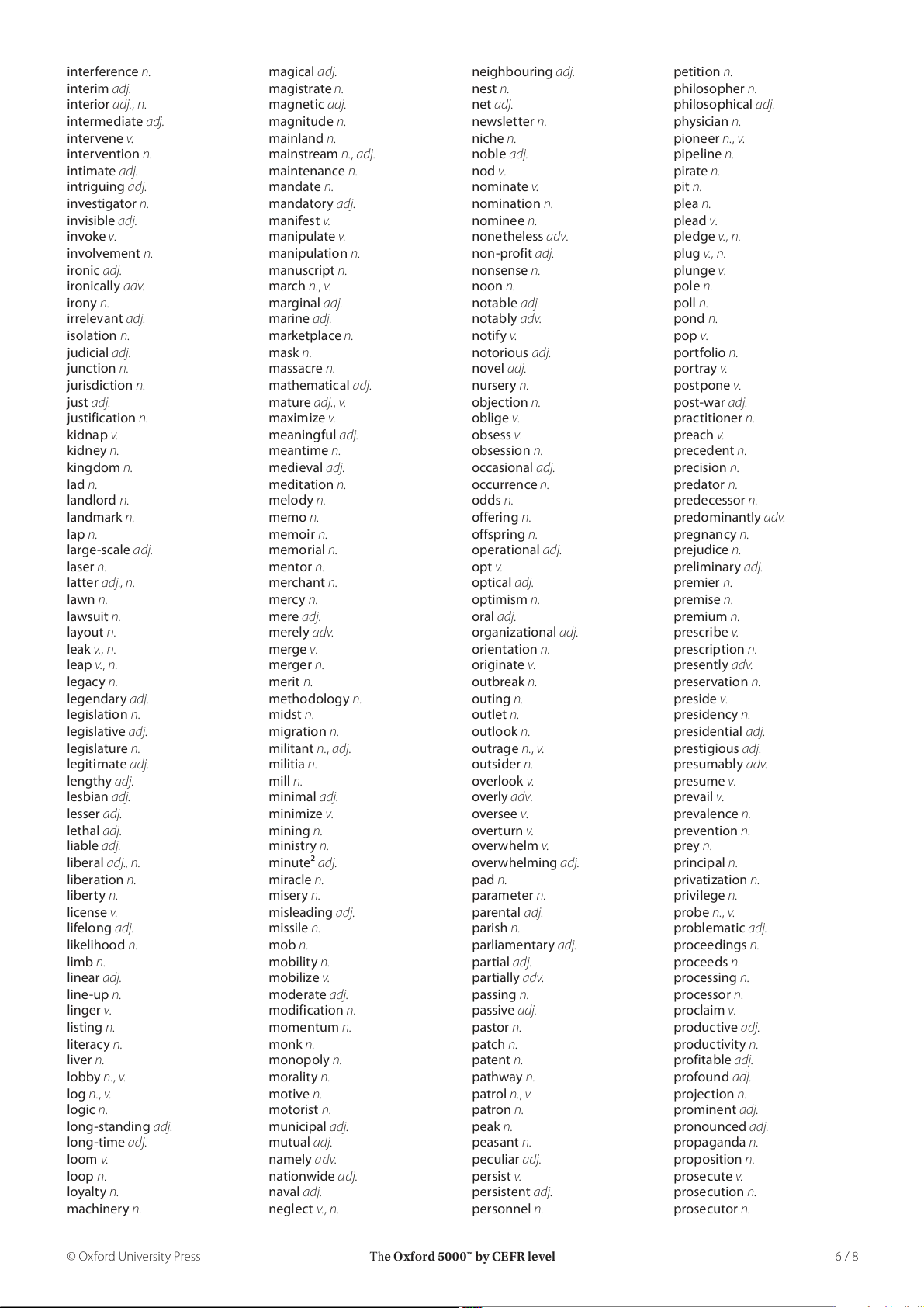The Oxford 5000™ by CEFR level 5 / 8 interference n. magical adj. neighbouring adj. petition n. interim adj. magistrate n. nest n. philosopher n. interior adj., n. magnetic adj. net adj. philosophical adj. intermediate adj. magnitude n. newsletter n. physician n. intervene v. mainland n. niche n. pioneer n., v. intervention n. mainstream n., adj. noble adj. pipeline n. intimate adj. maintenance n. nod v. pirate n. intriguing adj. mandate n. nominate v. pit n. investigator n. mandatory adj. nomination n. plea n. invisible adj. manifest v. nominee n. plead v. invoke v. manipulate v. nonetheless adv. pledge v., n. involvement n. manipulation n. non-profit adj. plug v., n. ironic adj. manuscript n. nonsense n. plunge v. ironically adv. march n., v. noon n. pole n. irony n. marginal adj. notable adj. poll n. irrelevant adj. marine adj. notably adv. pond n. isolation n. marketplace n. notify v. pop v. judicial adj. mask n. notorious adj. portfolio n. junction n. massacre n. novel adj. portray v. jurisdiction n. mathematical adj. nursery n. postpone v. just adj. mature adj., v. objection n. post-war adj. justification n. maximize v. oblige v. practitioner n. kidnap v. meaningful adj. obsess v. preach v. kidney n. meantime n. obsession n. precedent n. kingdom n. medieval adj. occasional adj. precision n. lad n. meditation n. occurrence n. predator n. landlord n. melody n. odds n. predecessor n. landmark n. memo n. offering n. predominantly adv. lap n. memoir n. offspring n. pregnancy n. large-scale adj. memorial n. operational adj. prejudice n. laser n. mentor n. opt v. preliminary adj. latter adj., n. merchant n. optical adj. premier n. lawn n. mercy n. optimism n. premise n. lawsuit n. mere adj. oral adj. premium n. layout n. merely adv. organizational adj. prescribe v. leak v., n. merge v. orientation n. prescription n. leap v., n. merger n. originate v. presently adv. legacy n. merit n. outbreak n. preservation n. legendary adj. methodology n. outing n. preside v. legislation n. midst n. outlet n. presidency n. legislative adj. migration n. outlook n. presidential adj. legislature n. militant n., adj. outrage n., v. prestigious adj. legitimate adj. militia n. outsider n. presumably adv. lengthy adj. mill n. overlook v. presume v. lesbian adj. minimal adj. overly adv. prevail v. lesser adj. minimize v. oversee v. prevalence n. lethal adj. mining n. overturn v. prevention n. liable adj. ministry n. overwhelm v. prey n. liberal adj., n. minute2 adj. overwhelming adj. principal n. liberation n. miracle n. pad n. privatization n. liberty n. misery n. parameter n. privilege n. license v. misleading adj. parental adj. probe n., v. lifelong adj. missile n. parish n. problematic adj. likelihood n. mob n. parliamentary adj. proceedings n. limb n. mobility n. partial adj. proceeds n. linear adj. mobilize v. partially adv. processing n. line-up n. moderate adj. passing n. processor n. linger v. modification n. passive adj. proclaim v. listing n. momentum n. pastor n. productive adj. literacy n. monk n. patch n. productivity n. liver n. monopoly n. patent n. profitable adj. lobby n., v. morality n. pathway n. profound adj. log n., v. motive n. patrol n., v. projection n. logic n. motorist n. patron n. prominent adj. long-standing adj. municipal adj. peak n. pronounced adj. long-time adj. mutual adj. peasant n. propaganda n. loom v. namely adv. peculiar adj. proposition n. loop n. nationwide adj. persist v. prosecute v. loyalty n. naval adj. persistent adj. prosecution n. machinery n. neglect v., n. personnel n. prosecutor n. © Oxford University Press