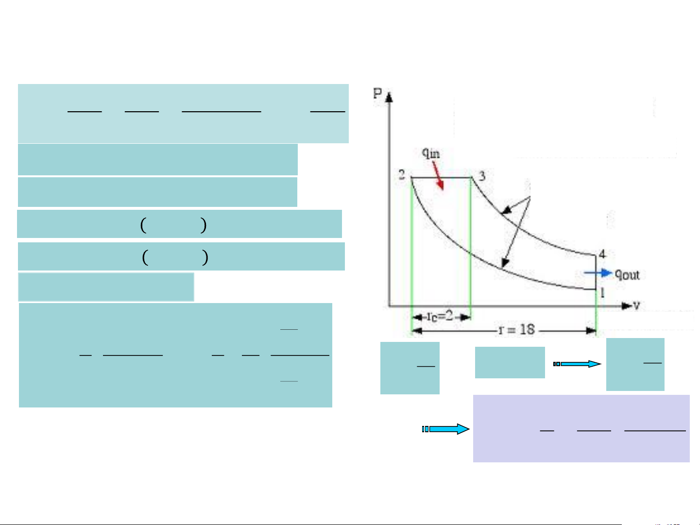 • Chu trình Diesel: Tính toán hiệu suất nhiệt Tỷ số nén r = v W Q Q − Q Q net net in out out = = = = 1− 1/v2 =18; th Q Q Q Q Tỷ số cắt rC = v3/v2 =2; in in in in