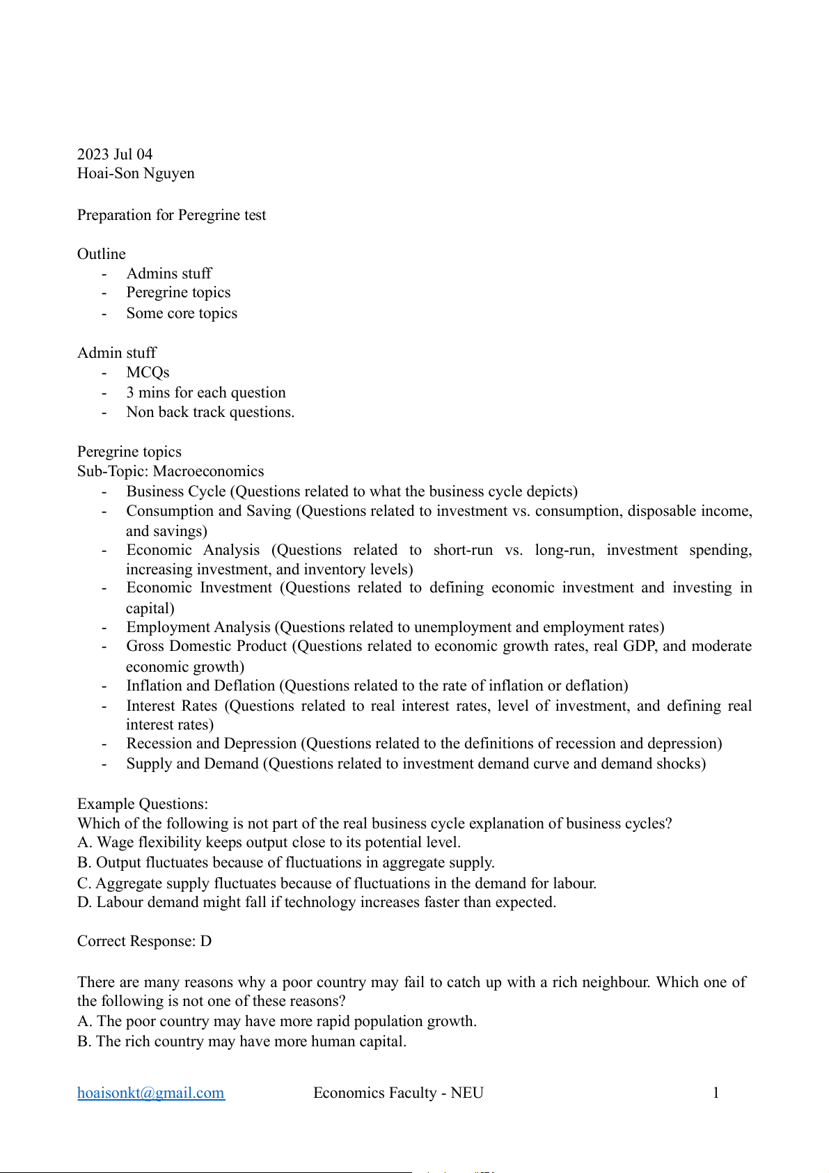 Preparation for Peregrine test Outline - Admins stuff - Peregrine topics - Some core topics Admin stuff - MCQs - 3 mins for each question - Non back track questions. Peregrine topics Sub-Topic: Macroeconomics -