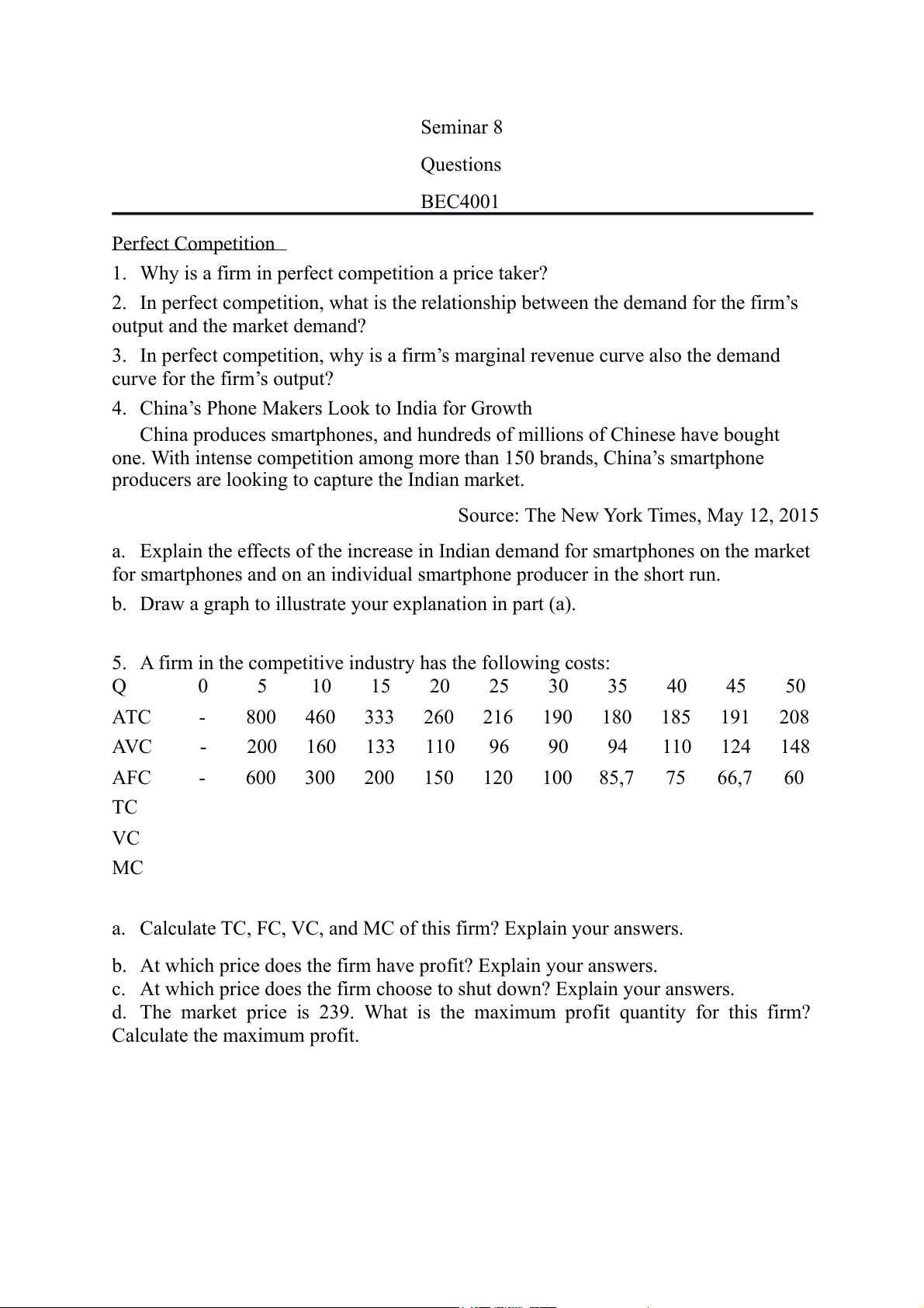 Seminar 8 Questions BEC4001 Perfect Competition
