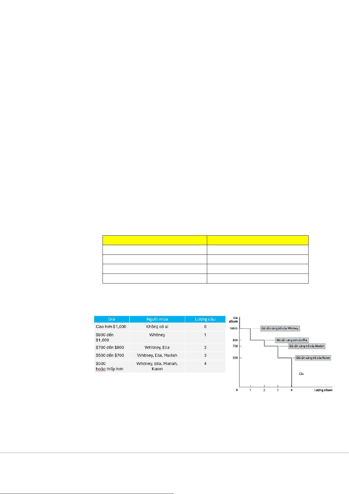 P=WTP: người mua bang quan về việc mua hàng hóa Người mua Giá sẵn sàng trả Whitney 1000 Ella 800 Mariah 700 Karen 500