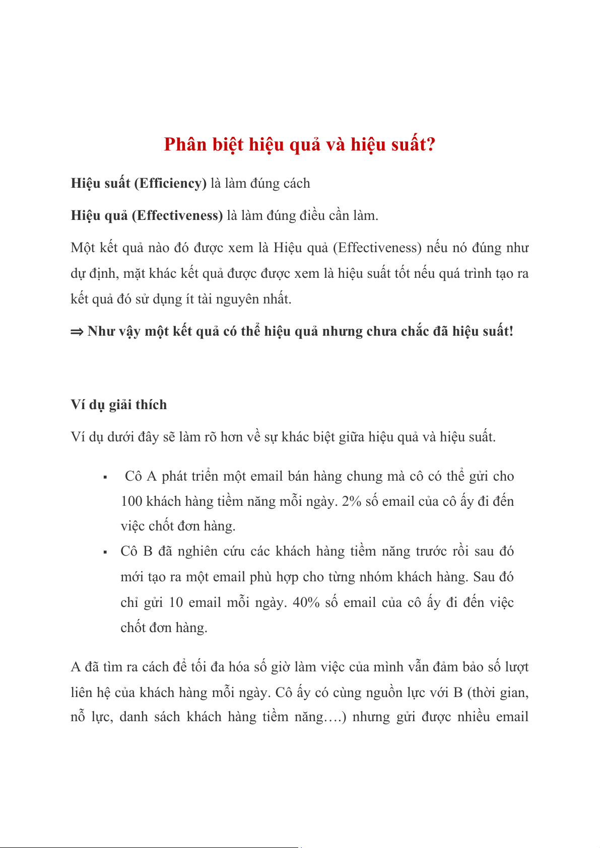 ⇒ Như vậy một kết quả có thể hiệu quả nhưng chưa chắc đã hiệu suất! Ví dụ giải thích