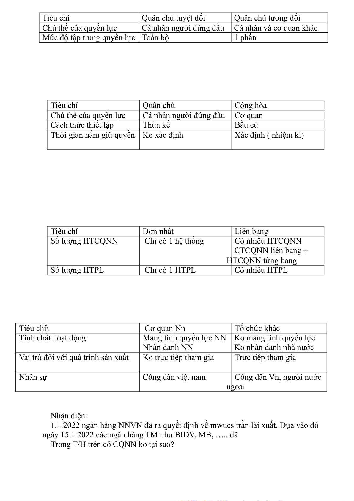 Thời gian nắm giữ quyền Ko xác định Xác định ( nhiệm kì) Tiêu chí Đơn nhất Liên bang Số lượng HTCQNN Chỉ có 1 hệ thống Có nhiều HTCQNN CTCQNN liên bang + HTCQNN từng bang Số lượng HTPL Chỉ có 1 HTPL Có nhiều HTPL Tiêu chí\ Cơ quan Nn Tổ chức khác Tính chất hoạt động