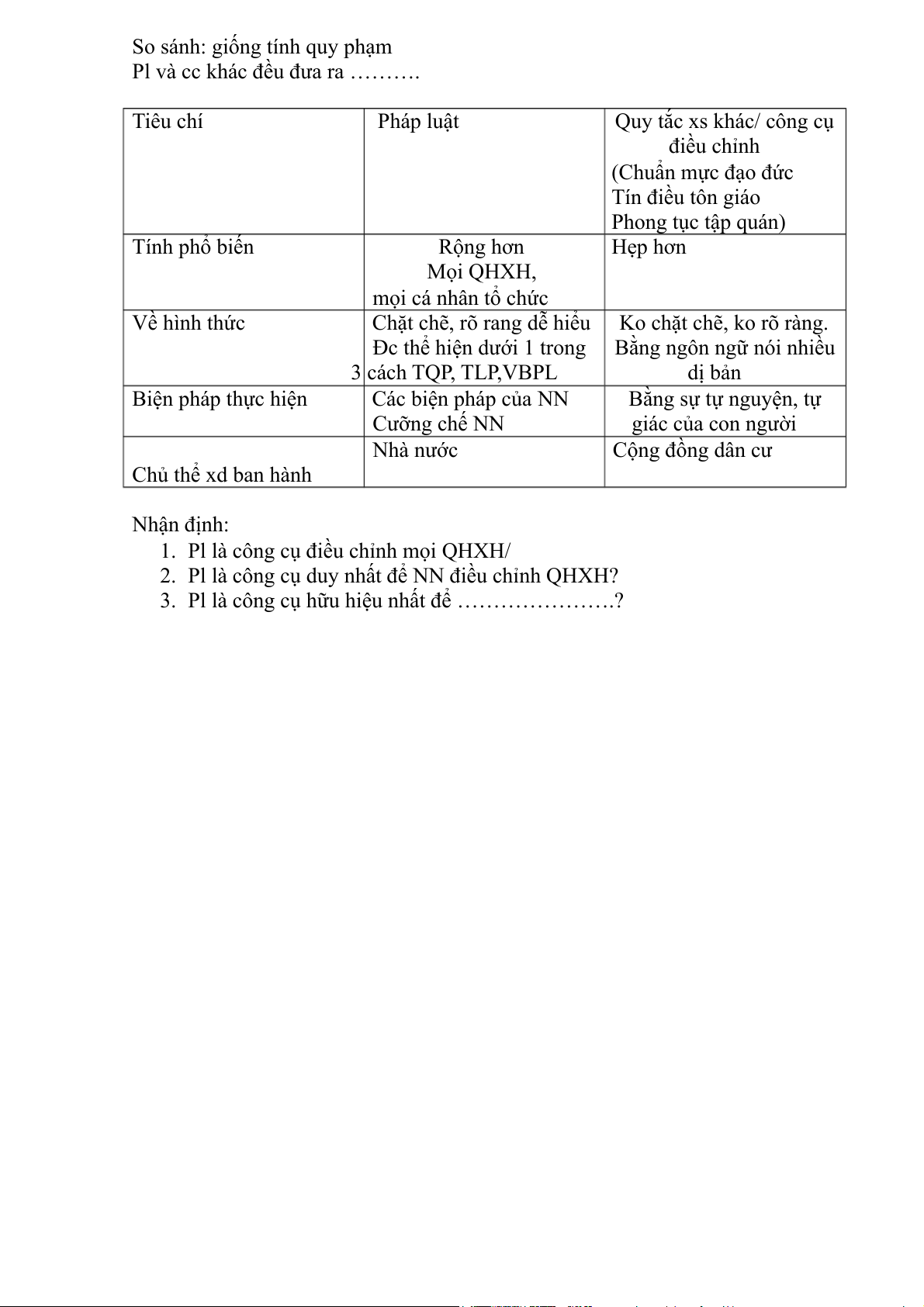 Pl và cc khác đều đưa ra ………. Tiêu chí Pháp luật Quy tắc xs khác/ công cụ điều chỉnh (Chuẩn mực đạo đức Tín điều tôn giáo Phong tục tập quán) Tính phổ biến Rộng hơn Hẹp hơn Mọi QHXH, mọi cá nhân tổ chức Về hình thức