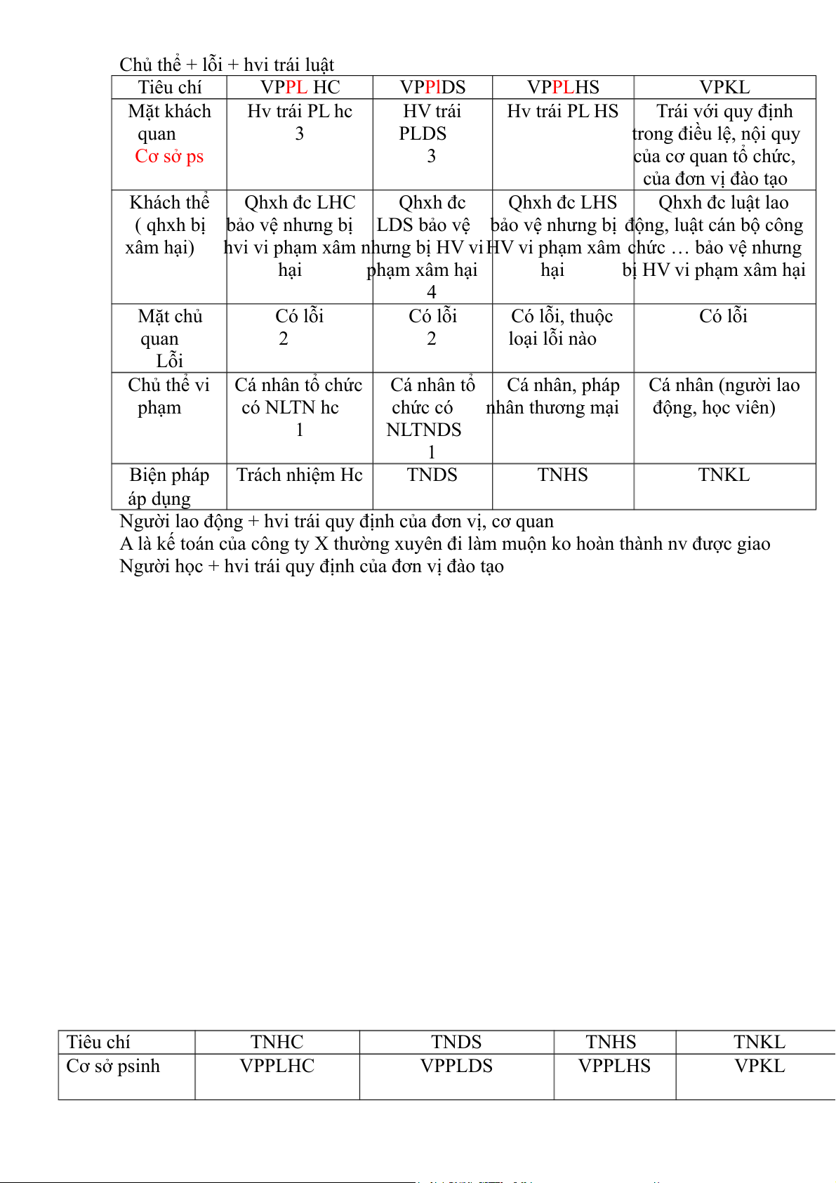 Chủ thể + lỗi + hvi trái luật Tiêu chí VPPL HC VPPlDS VPPLHS VPKL Mặt khách Hv trái PL hc HV trái Hv trái PL HS Trái với quy định quan 3 PLDS trong điều lệ, nội quy Cơ sở ps 3 của cơ quan tổ chức, của đơn vị đào tạo Khách thể Qhxh đc LHC Qhxh đc Qhxh đc LHS Qhxh đc luật lao